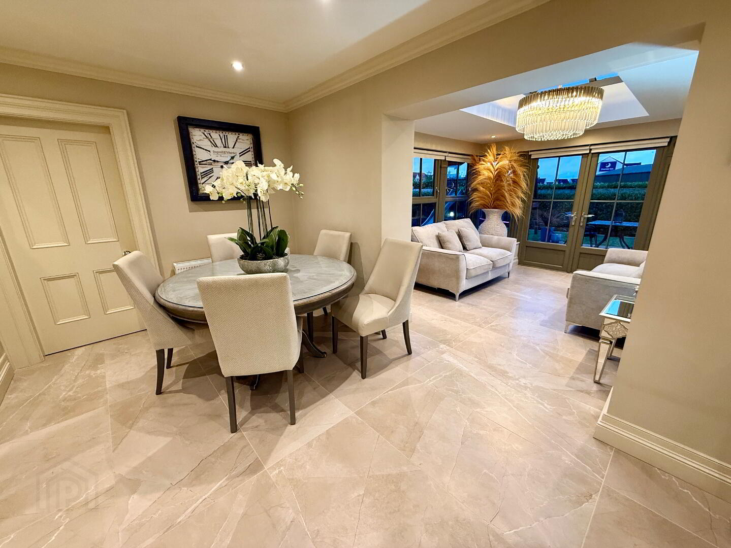 Orangery  with tiled floor, feature ceiling, double patio doors, tiled floor.