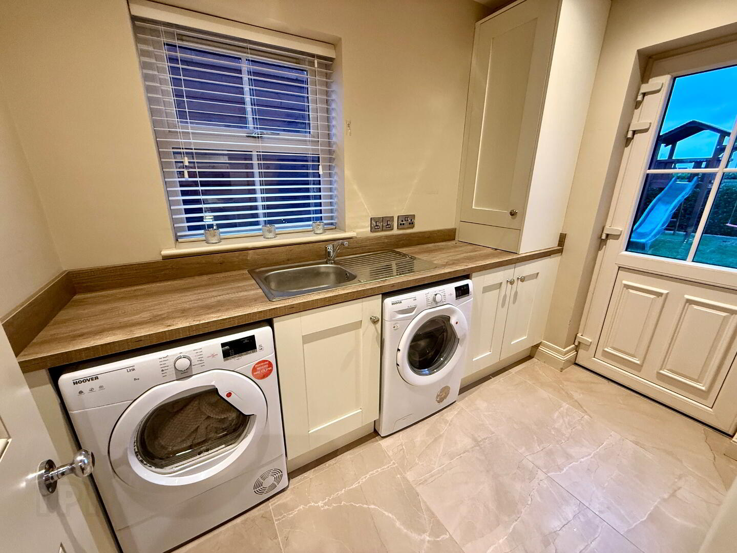 Utility Room  Low level units, single drainer steel sink unit with mixer tap, plumbed for washing machine, space for tumble dryer, tiled floor, recessed lighting.