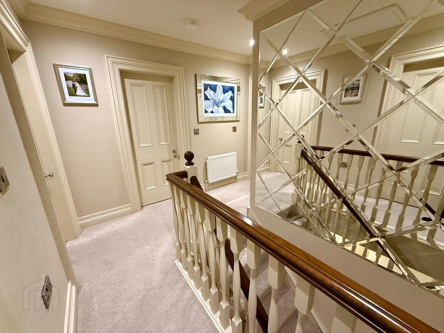 Landing  with storage cupboard, ceiling cornicing.