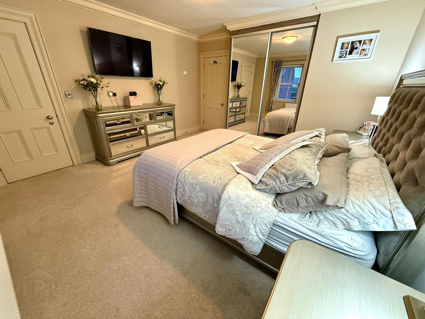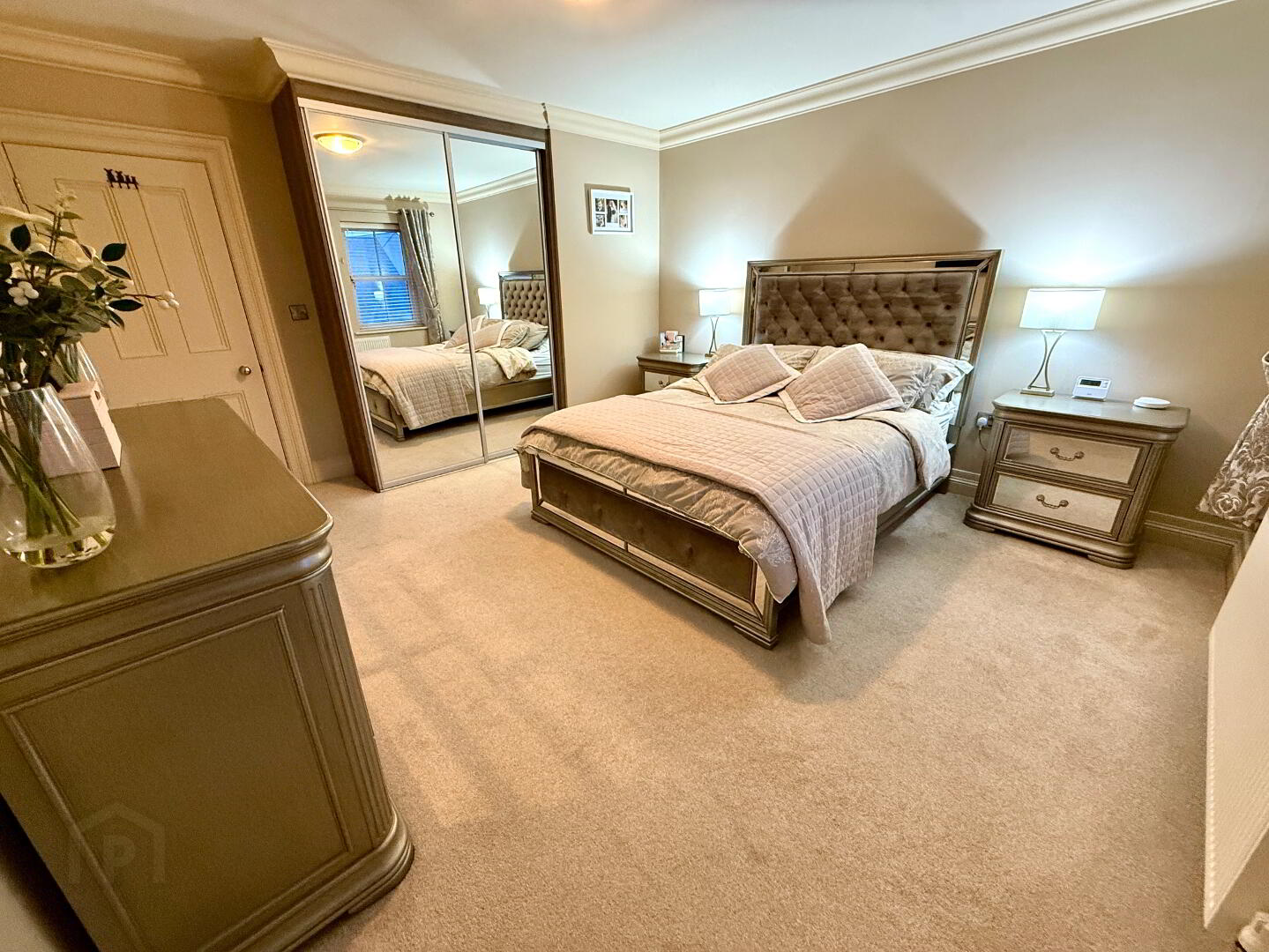 Bedroom 1  14'8 x 12'11 (to widest points)  Fitted with mirror sliderobes, ceiling cornicing.