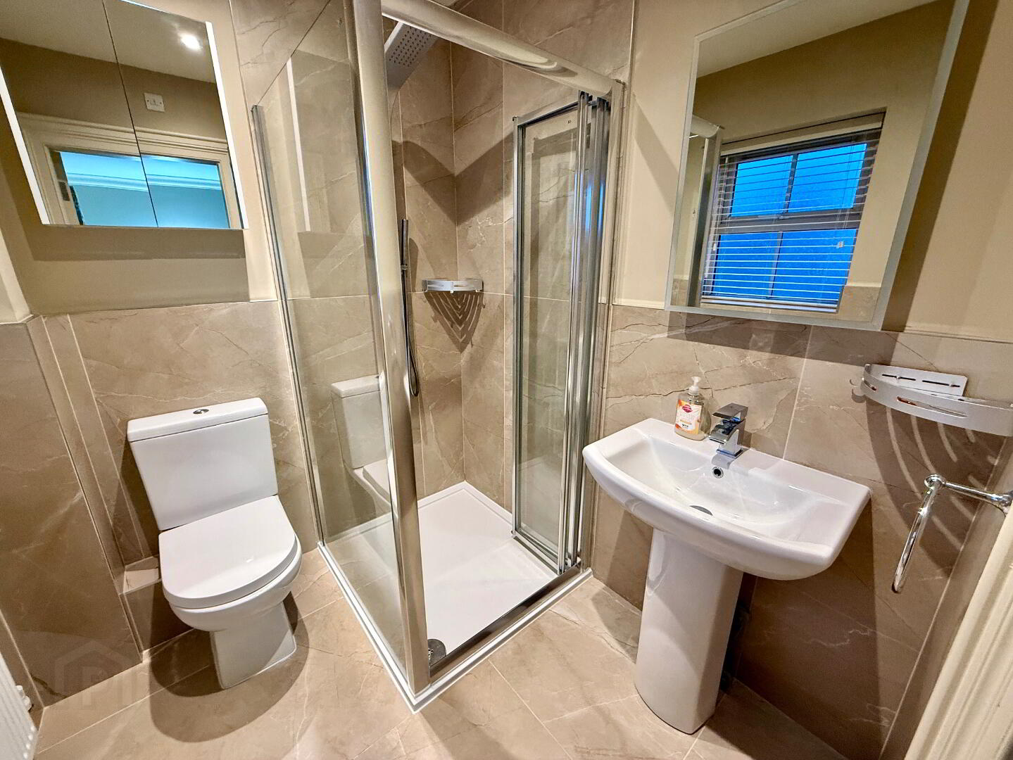 Ensuite  Fully tiled walk in jet shower, wash hand basin and WC, partly tiled walls, tiled floor, recessed lighting.