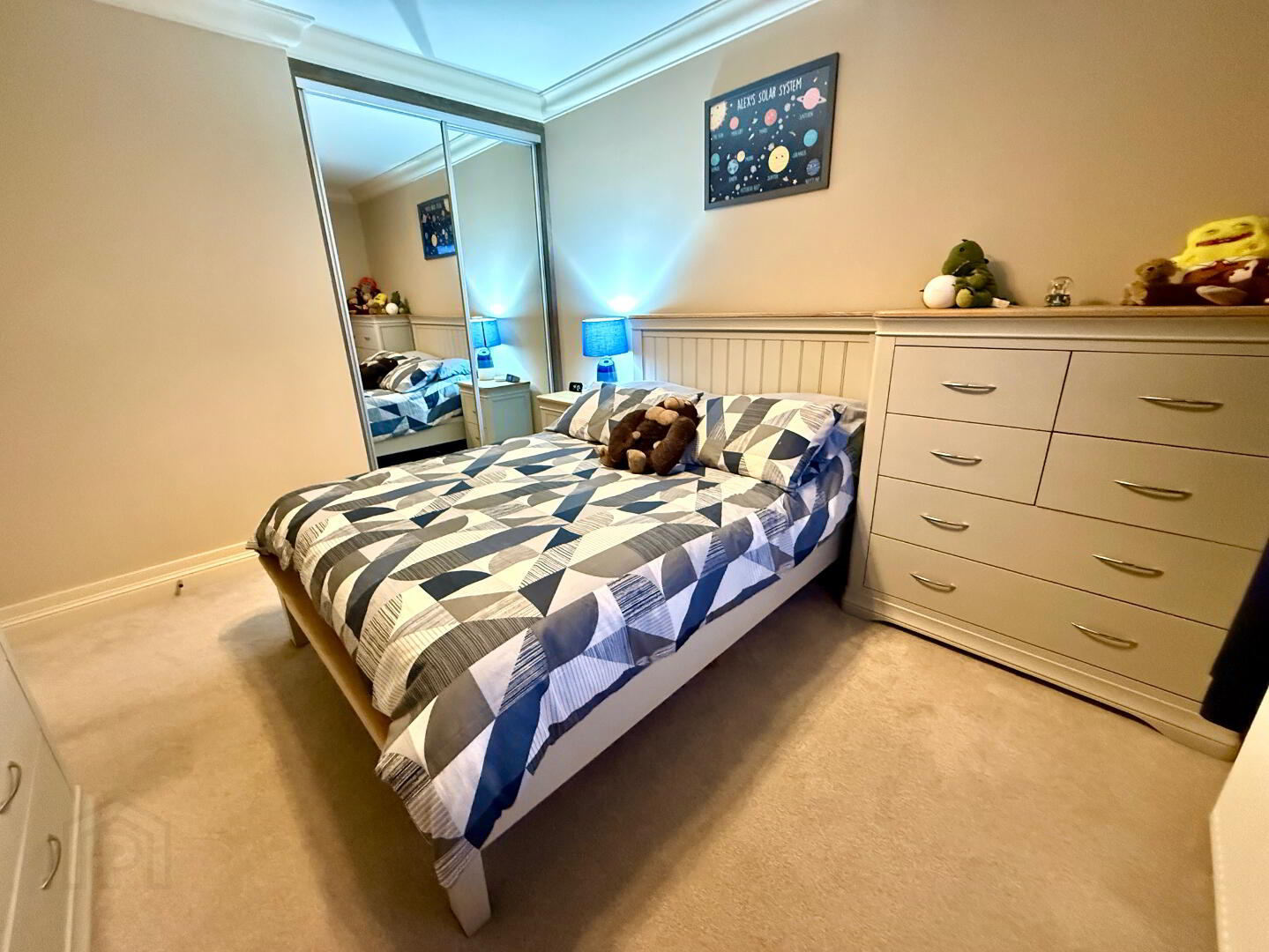 Bedroom 2  12'3 x 10'  Fitted with mirror sliderobes, ceiling cornicing.