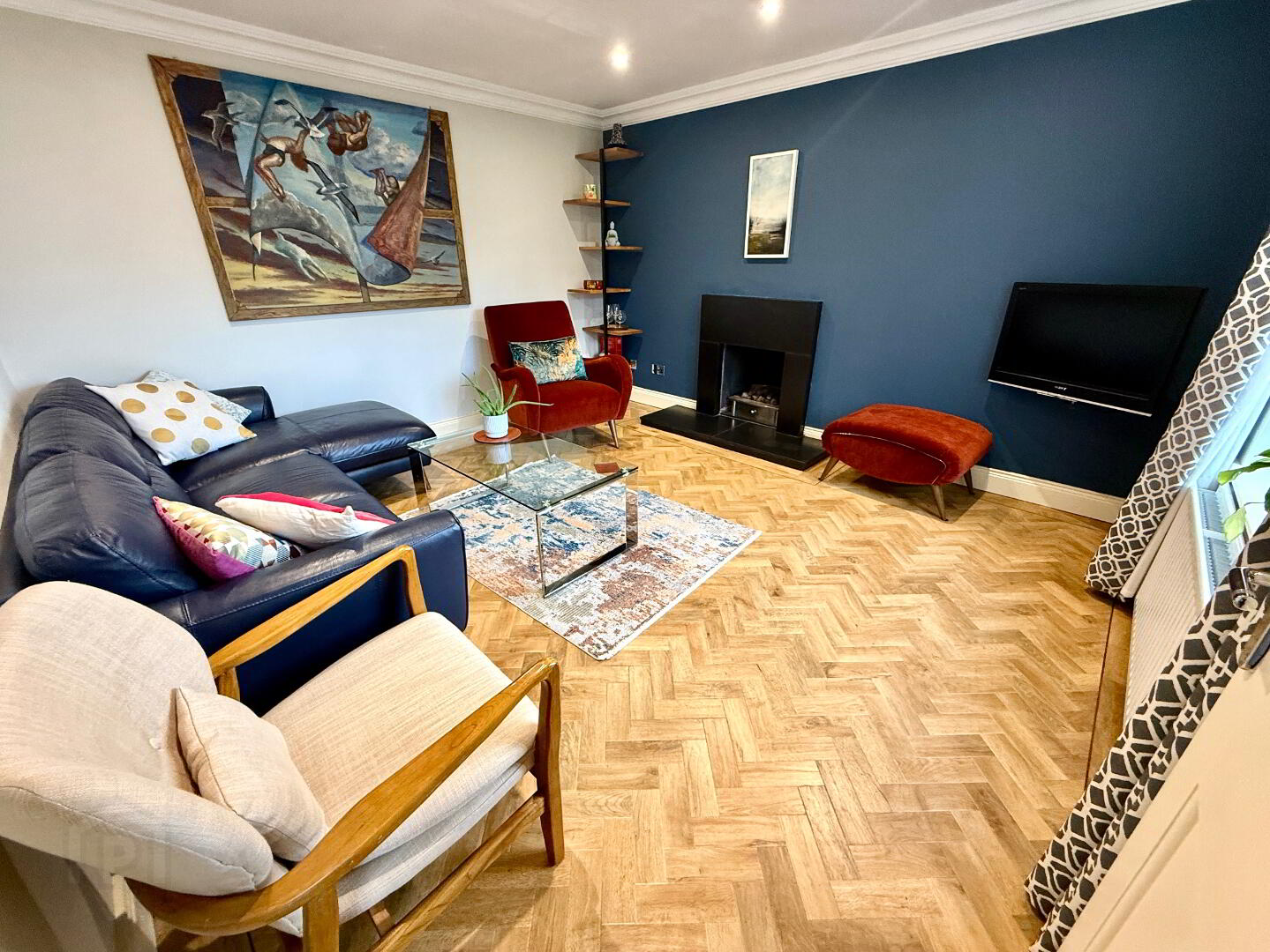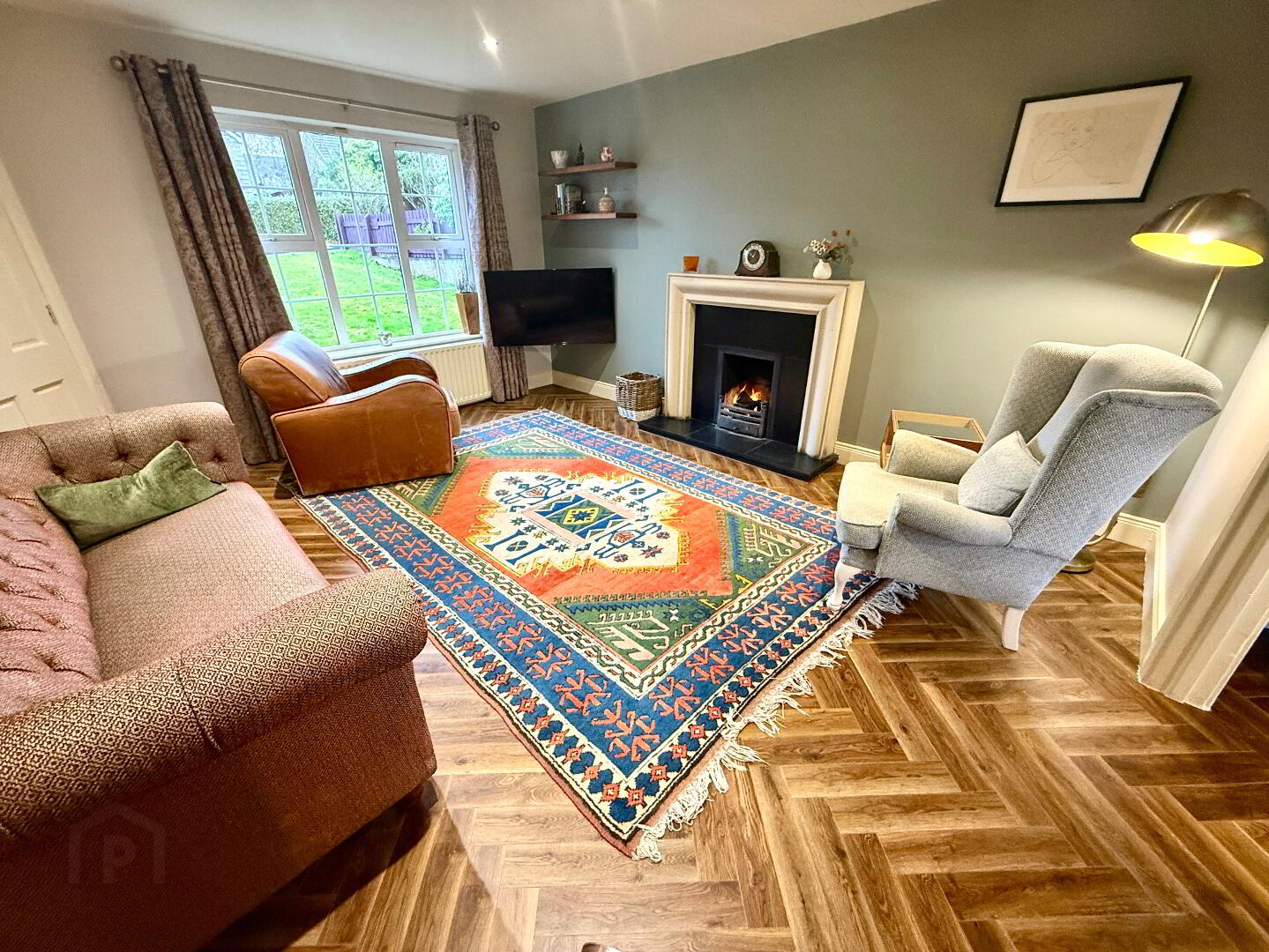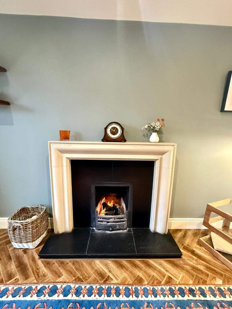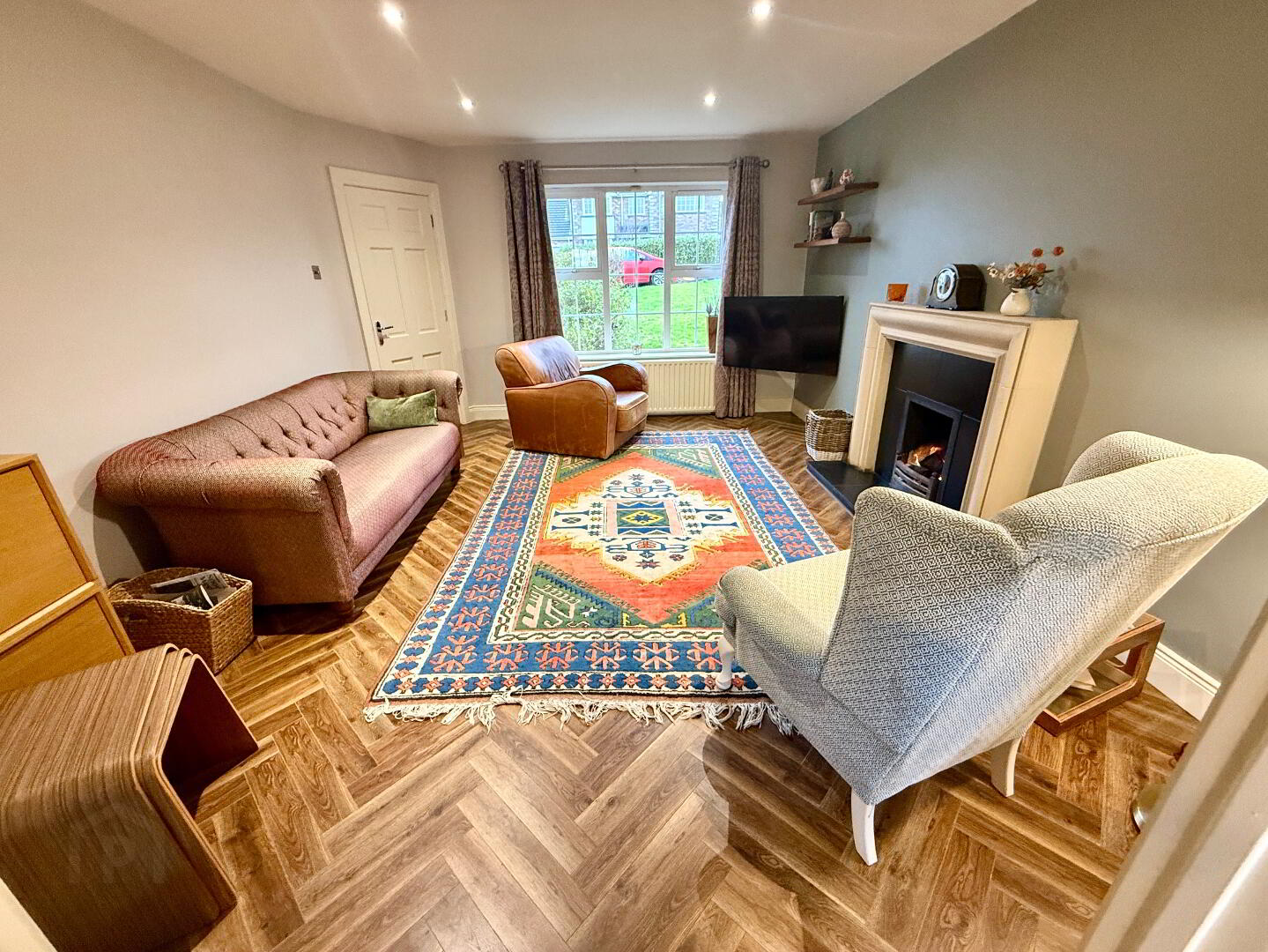 Lounge 15'1 x 12'8 (to widest points) Slate fireplace with sandstone effect surround and slate hearth, herringbone laminated wooden floor, recessed lighting.