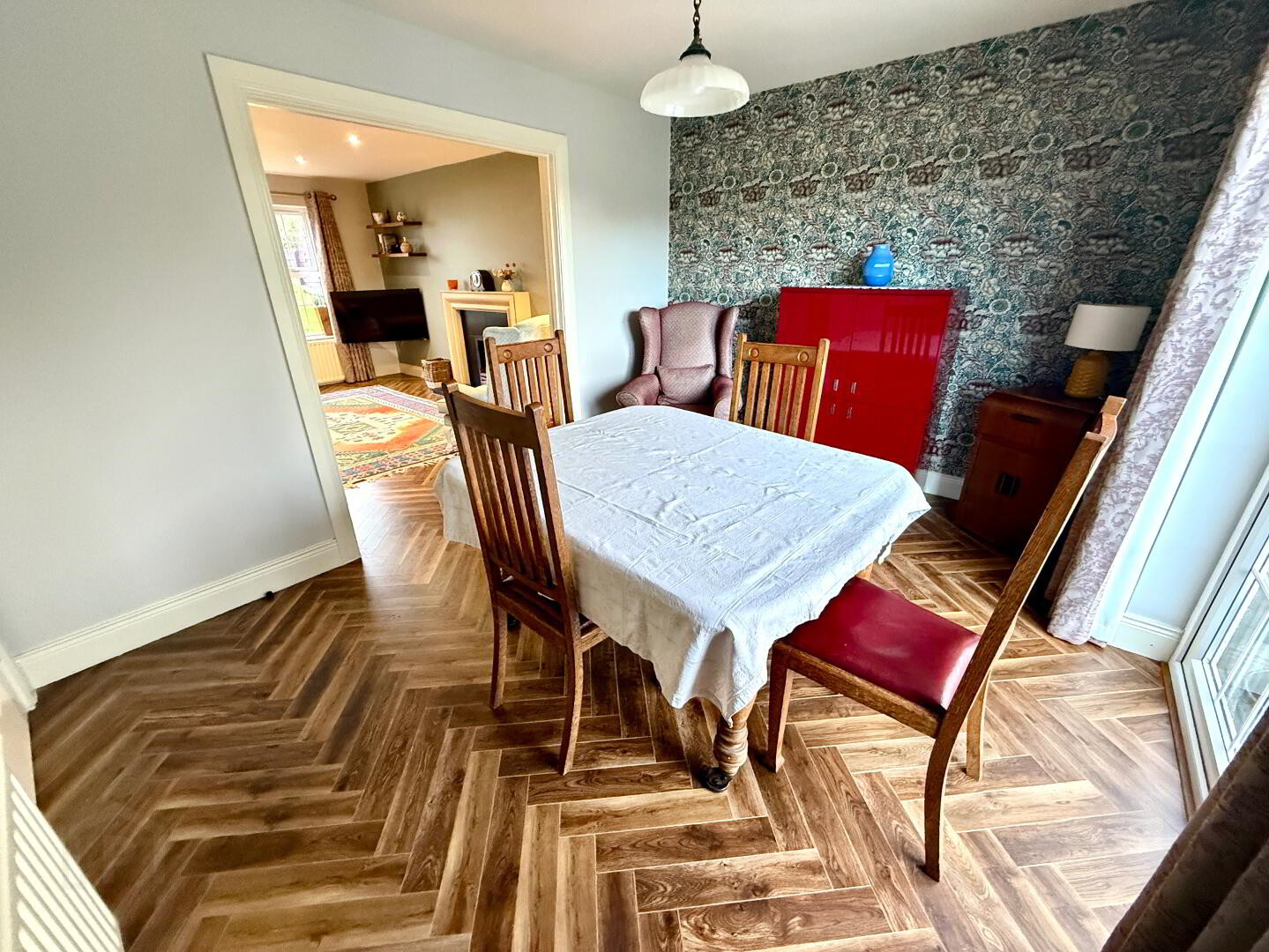 Dining Room 12'8 x 9'9 Herringbone laminated wooden floor, double patio doors.