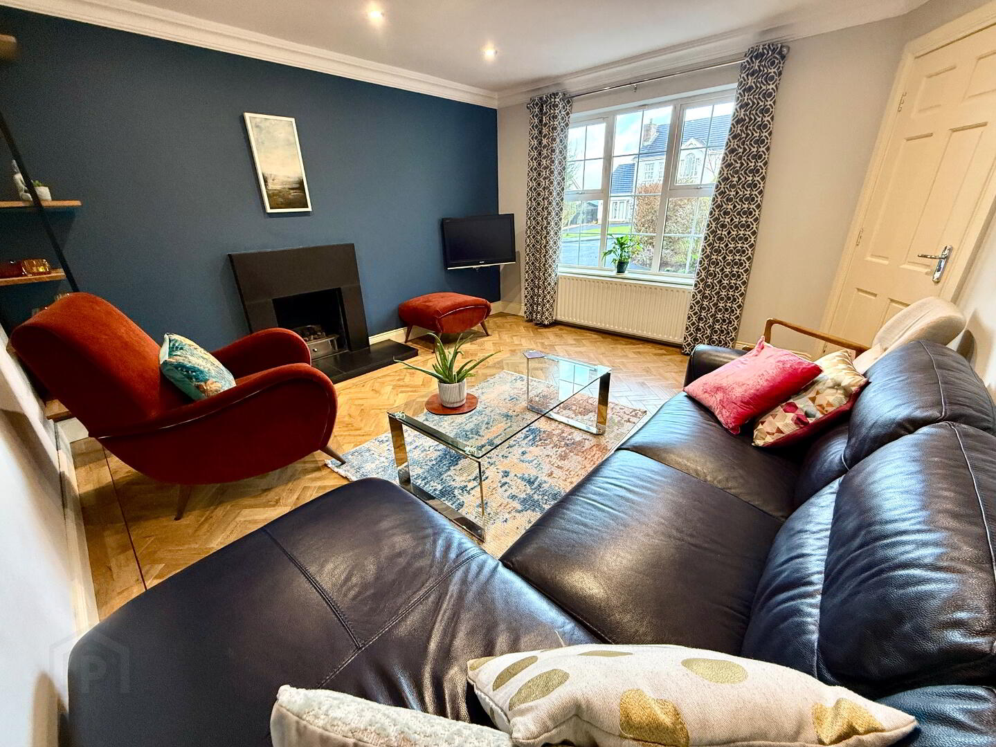 Family Room 13'7 x 12'7 (to widest points) Slate hearth and surround with gas fire insert, Karndean herringbone effect wooden flooring, ceiling cornicing, recessed lighting.
