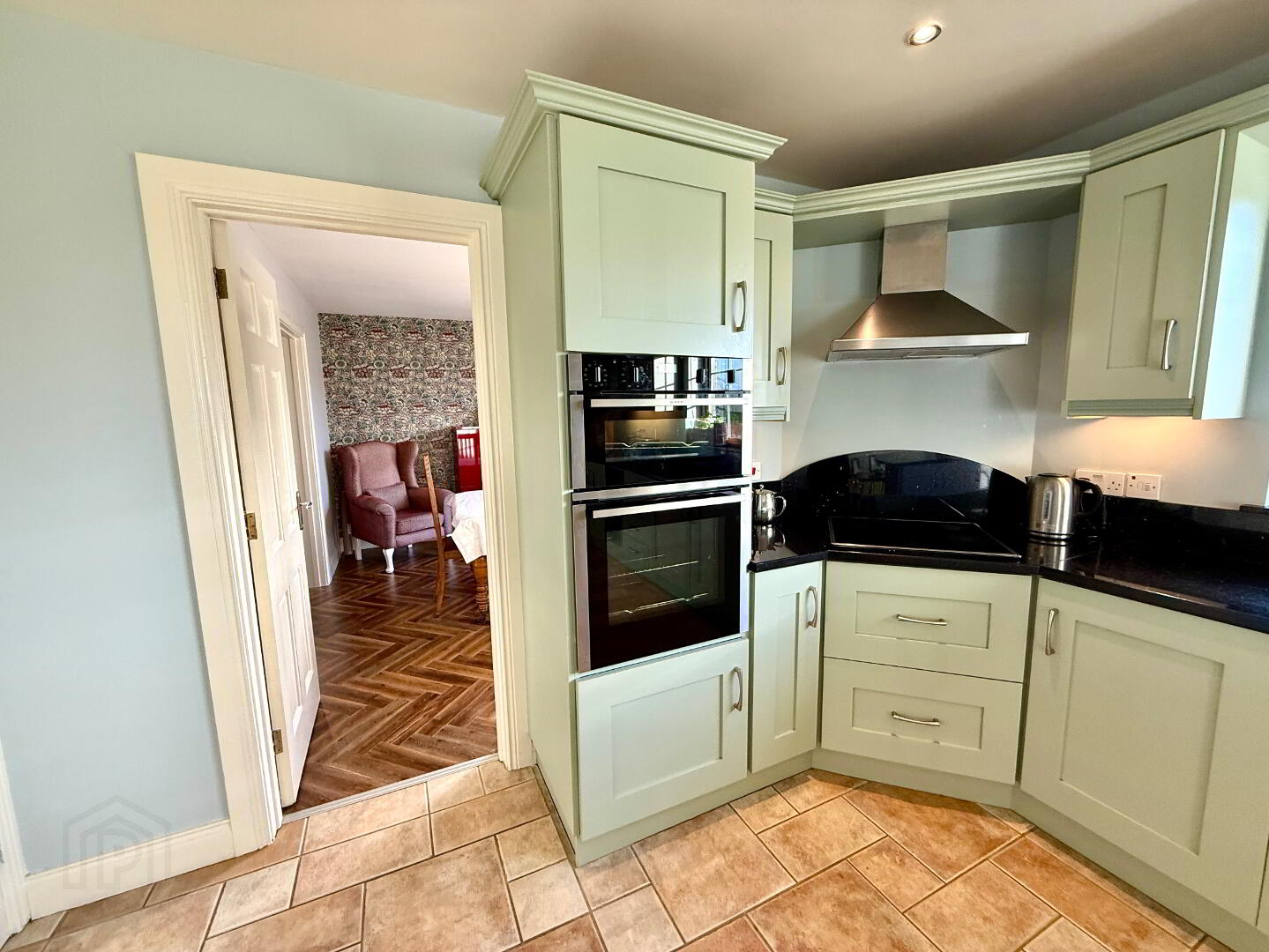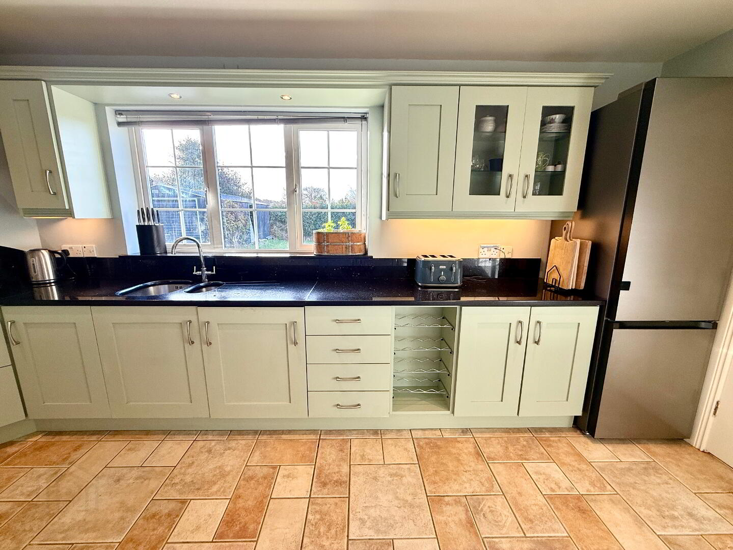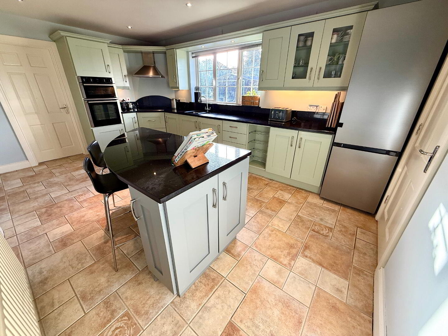 Kitchen/Dining 16'9 x 11'2 (to widest points) Eye and low level units, glazed display shelves, 1 1/4 bowl stainless steel sink unit with mixer tap set in granite worktop, hob, double wall oven and extractor fan, integrated dishwasher, wine rack, island with breakfast bar, understair storage, tiled floor, recessed lighting, concealed lighting below eye level units.