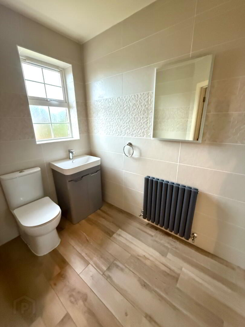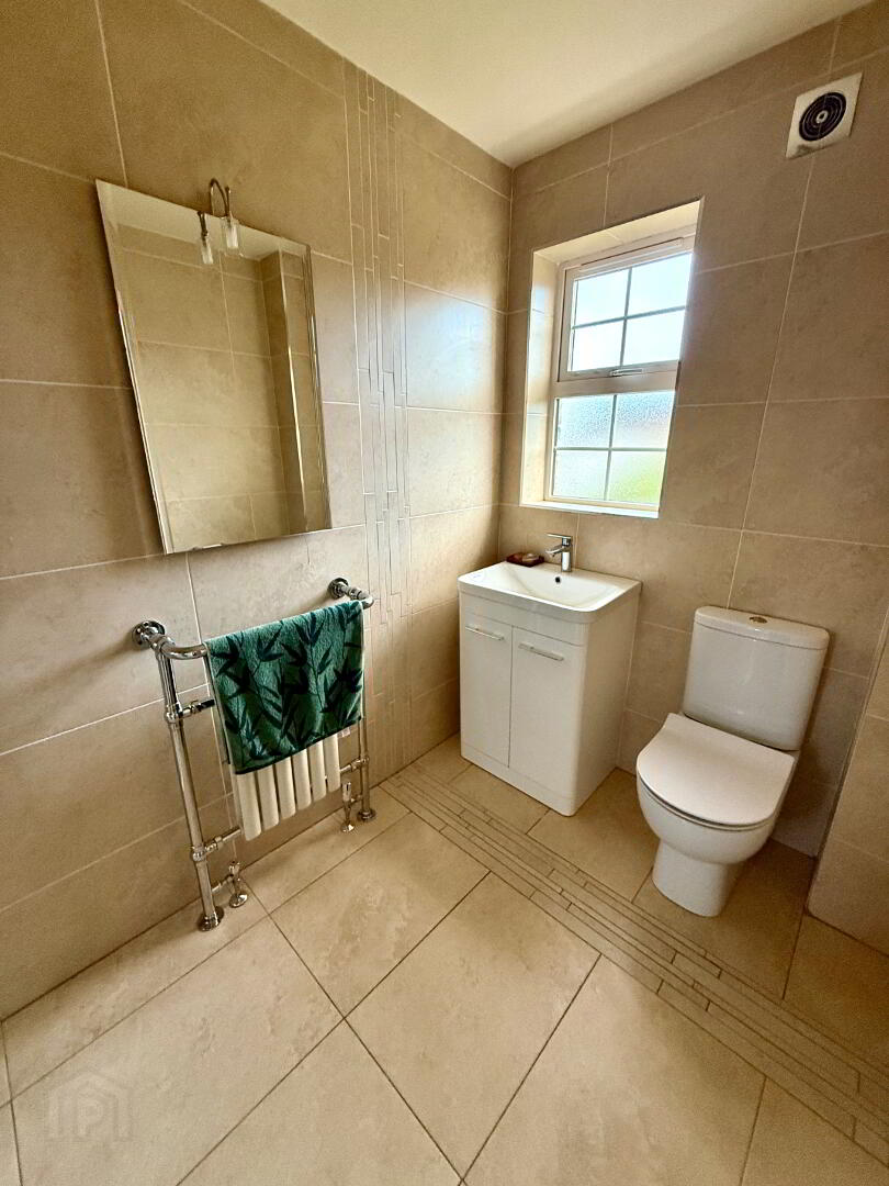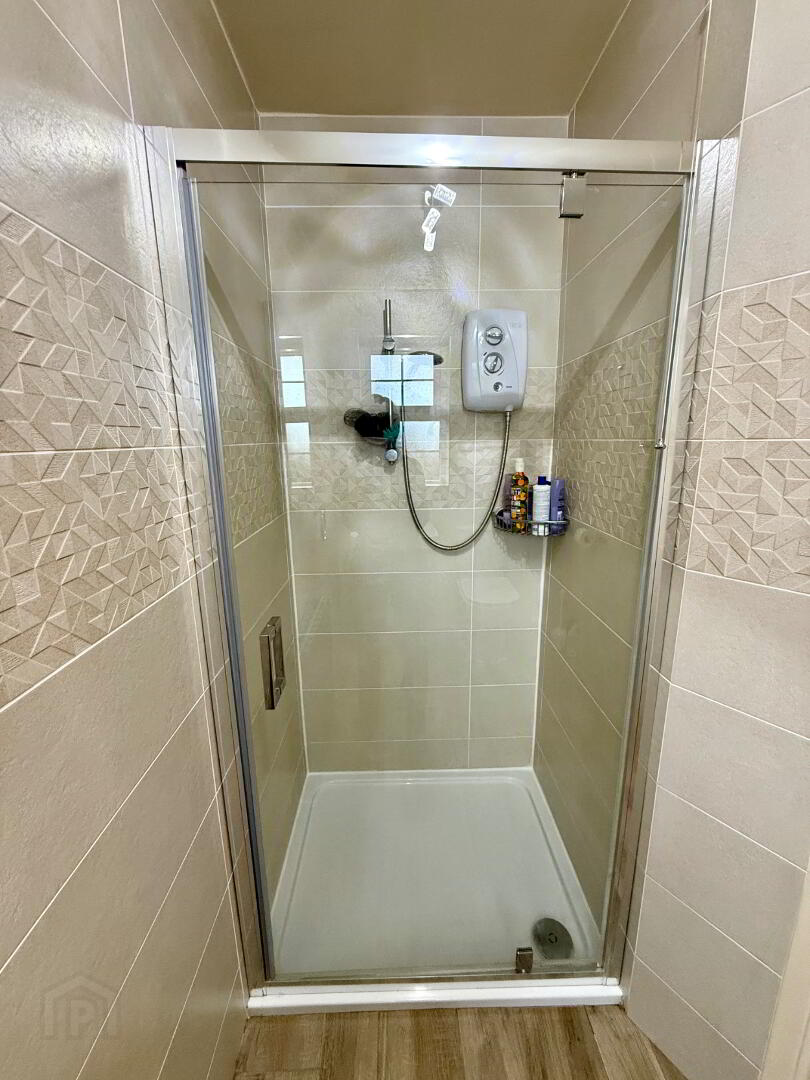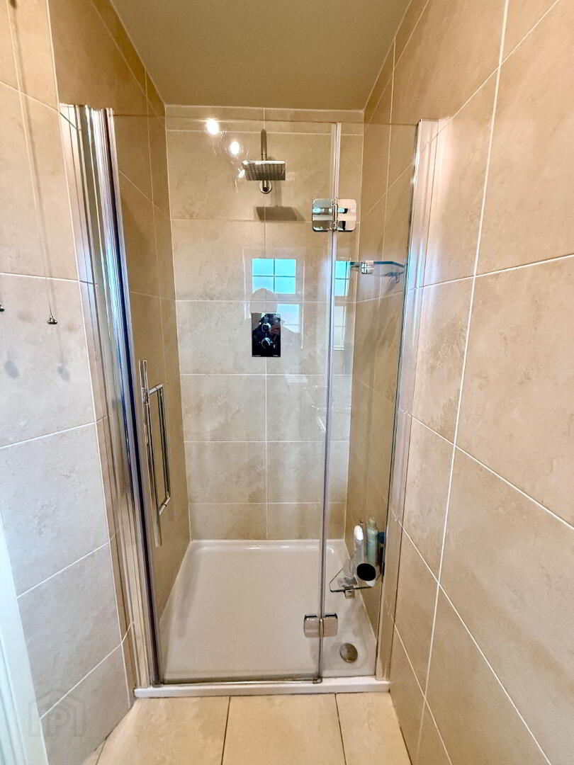 Ensuite Fully tiled walk in shower, wash hand basin set in vanity unit, WC, fully tiled walls, tiled floor.