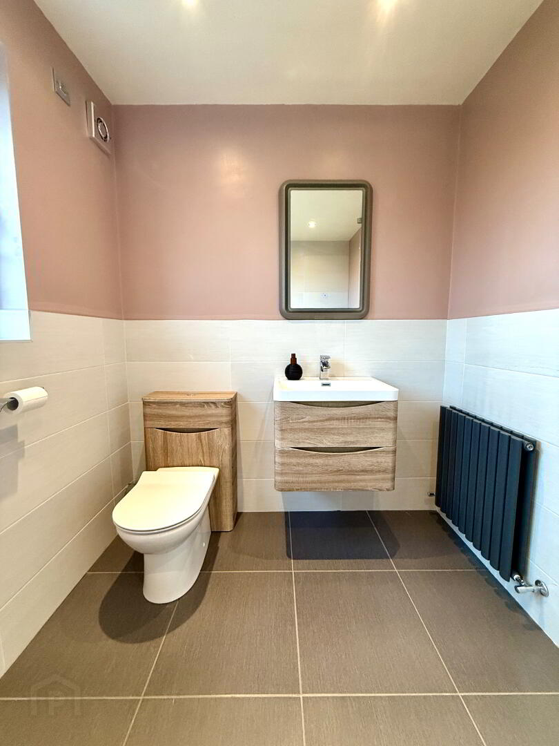 Downstairs WC Wash hand basin and WC, tiled floor, partly tiled walls.