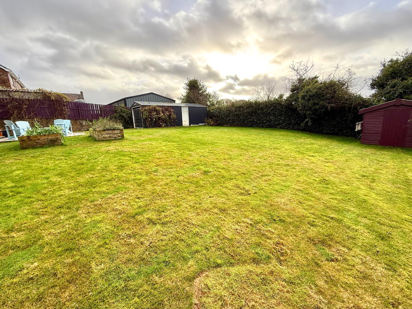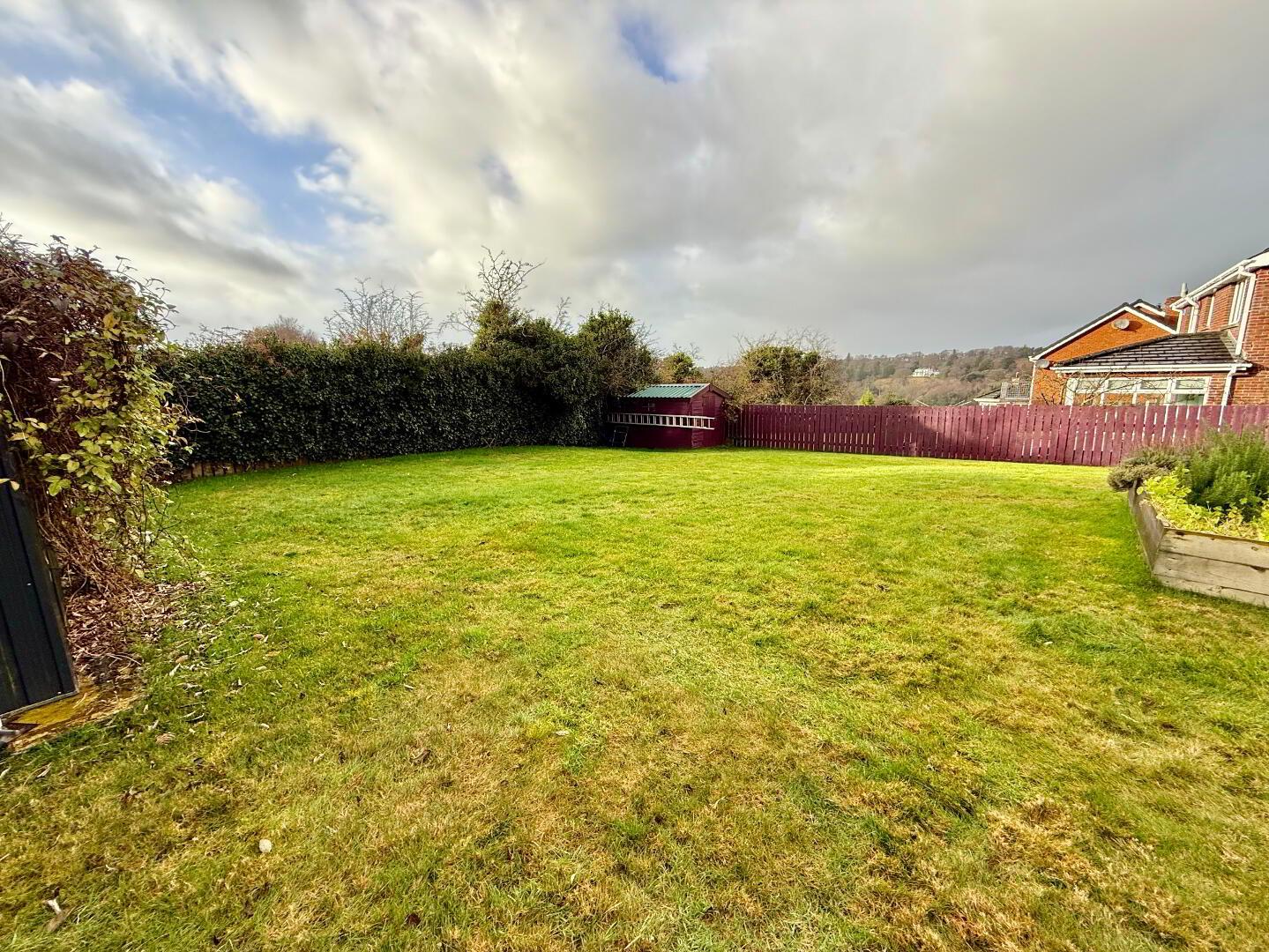 Garden to rear laid in lawn enclosed by hedge and fence.
