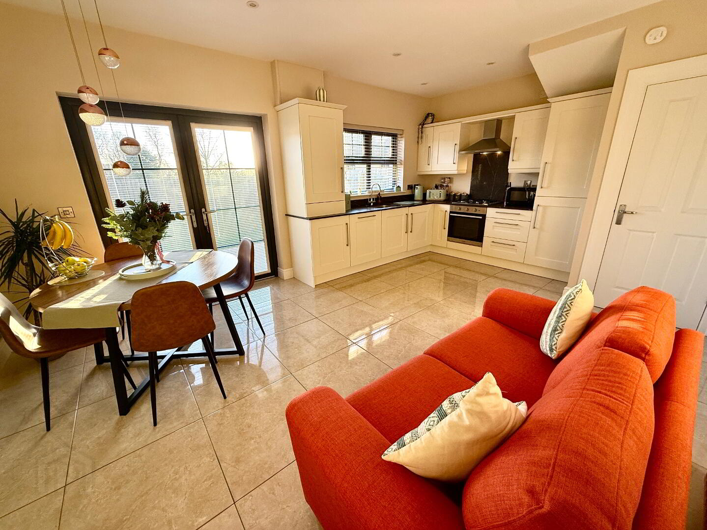 Kitchen/Dining 18'11 x 12'8 (to widest points) Eye and low level units, stainless steel sink unit set in Quartz worktop with mixer tap, hob, oven and extractor fan, integrated washer/dryer, integrated dishwasher, integrated fridge/freezer, storage cupboard, tiled floor, double patio doors.