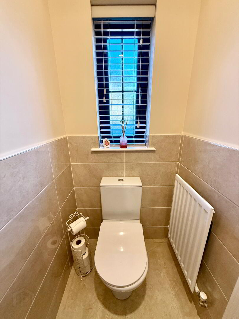 Downstairs WC WC and wash hand basin, partly tiled walls, tiled floor.