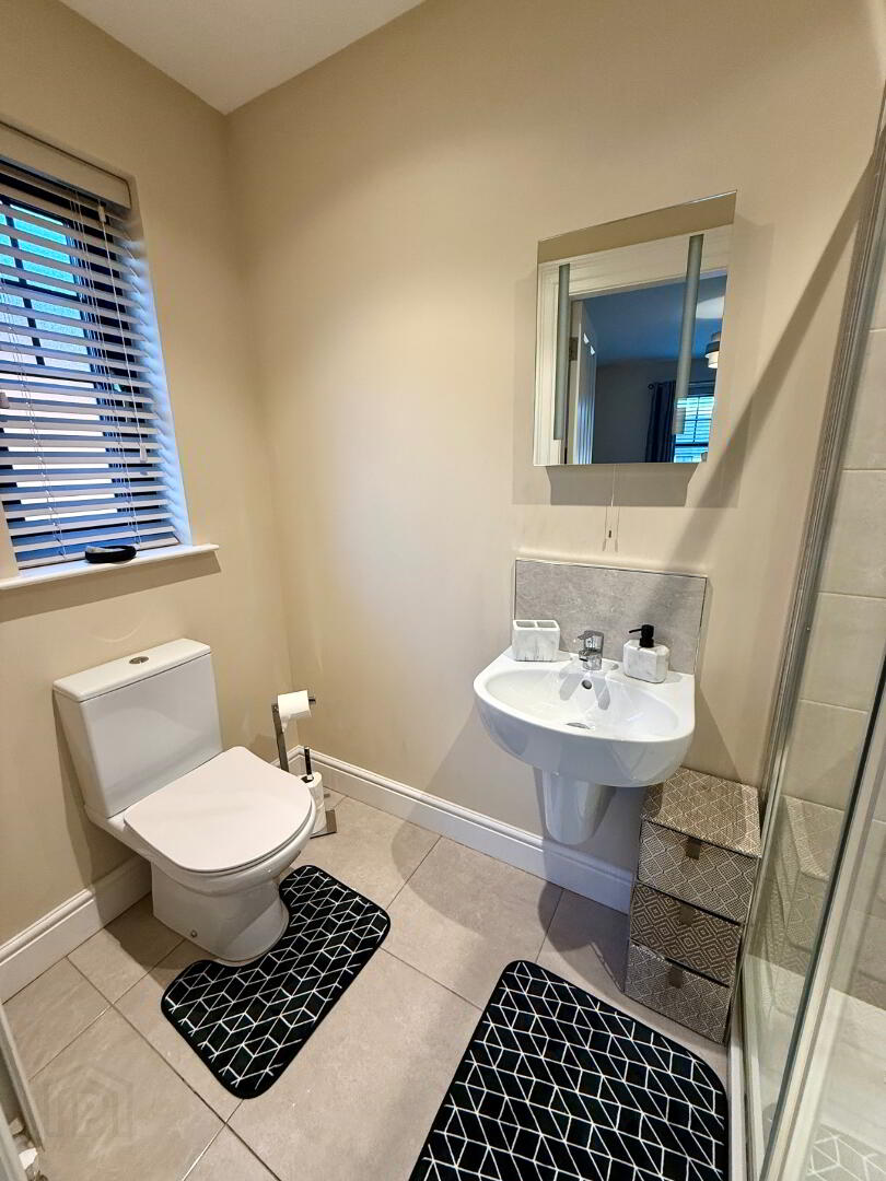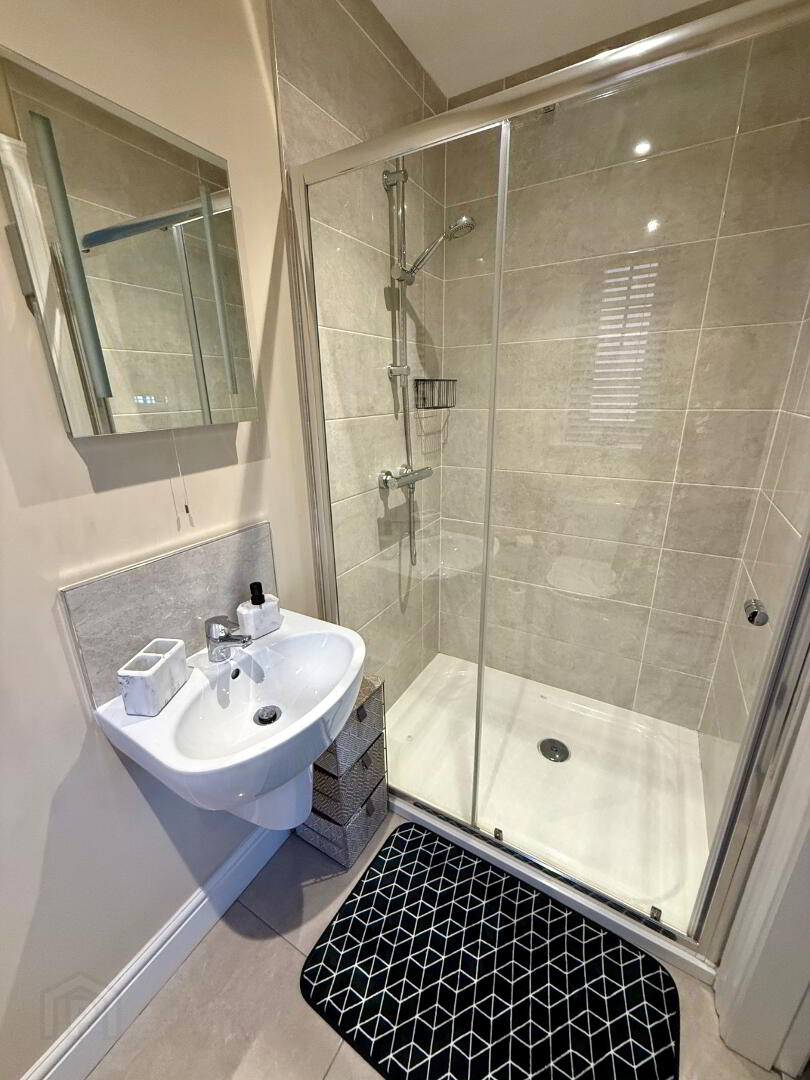 Ensuite Fully tiled walk in shower, wash hand basin and WC.