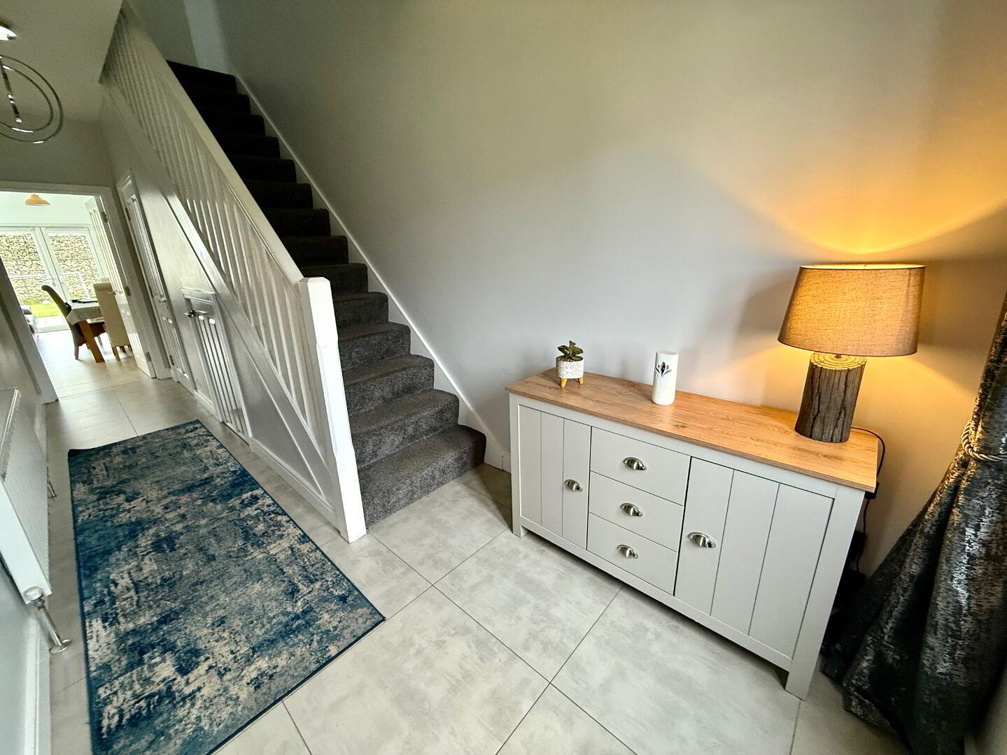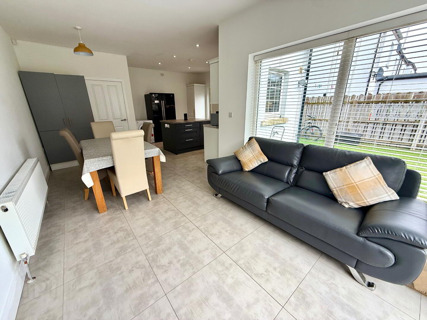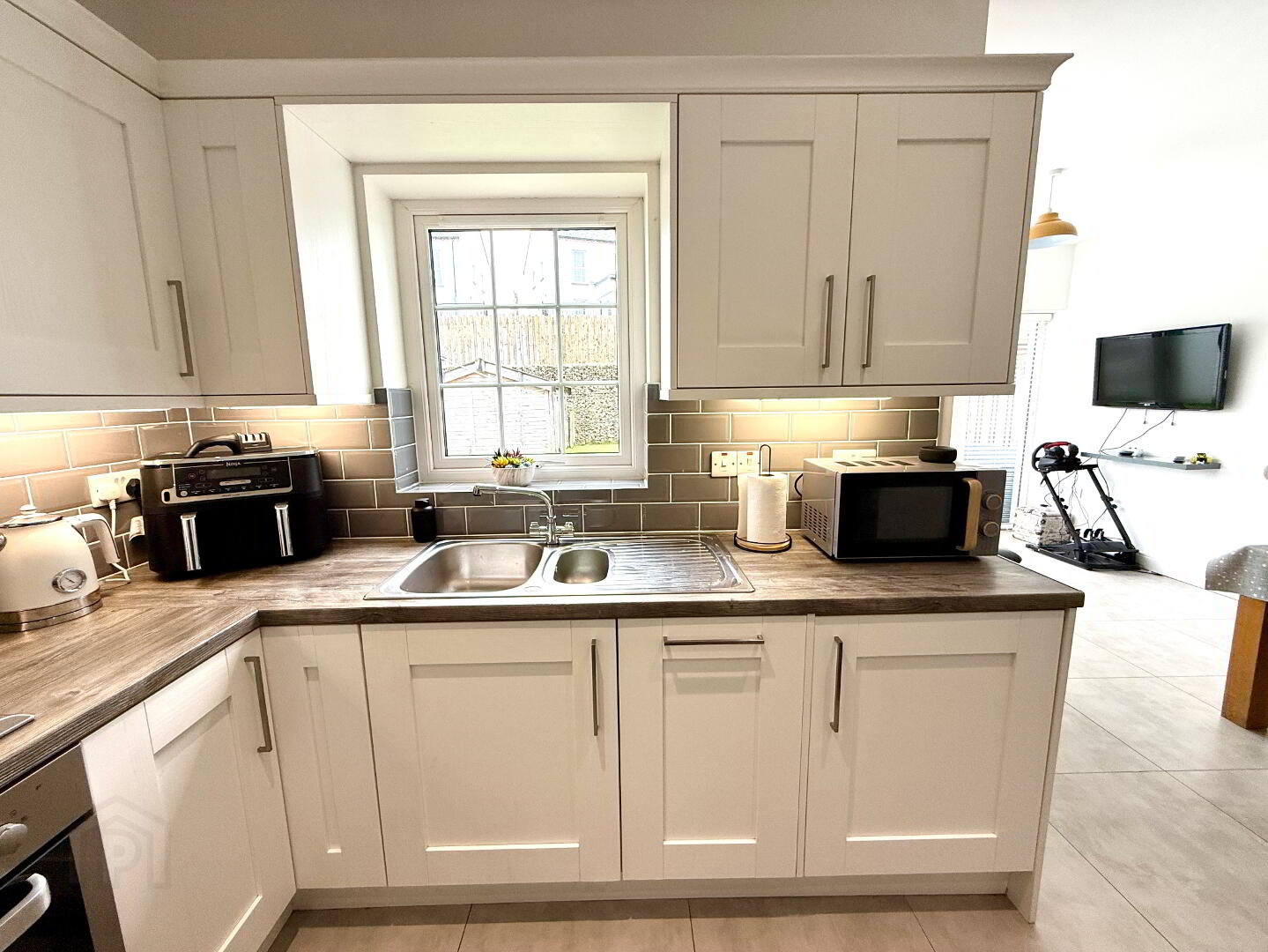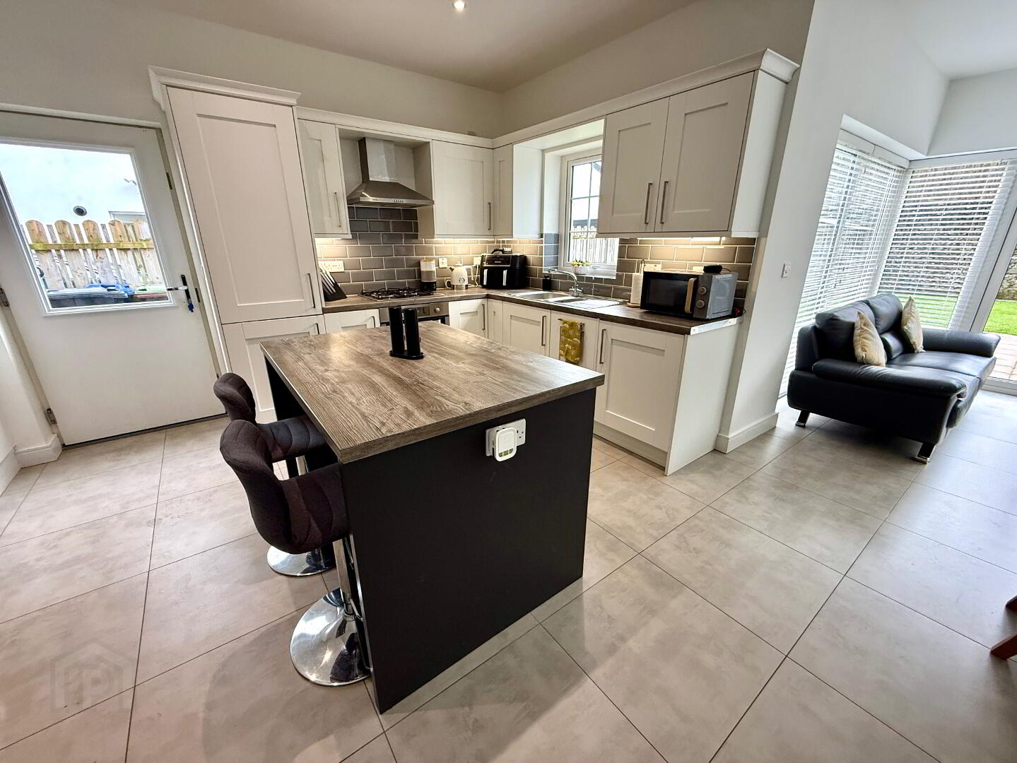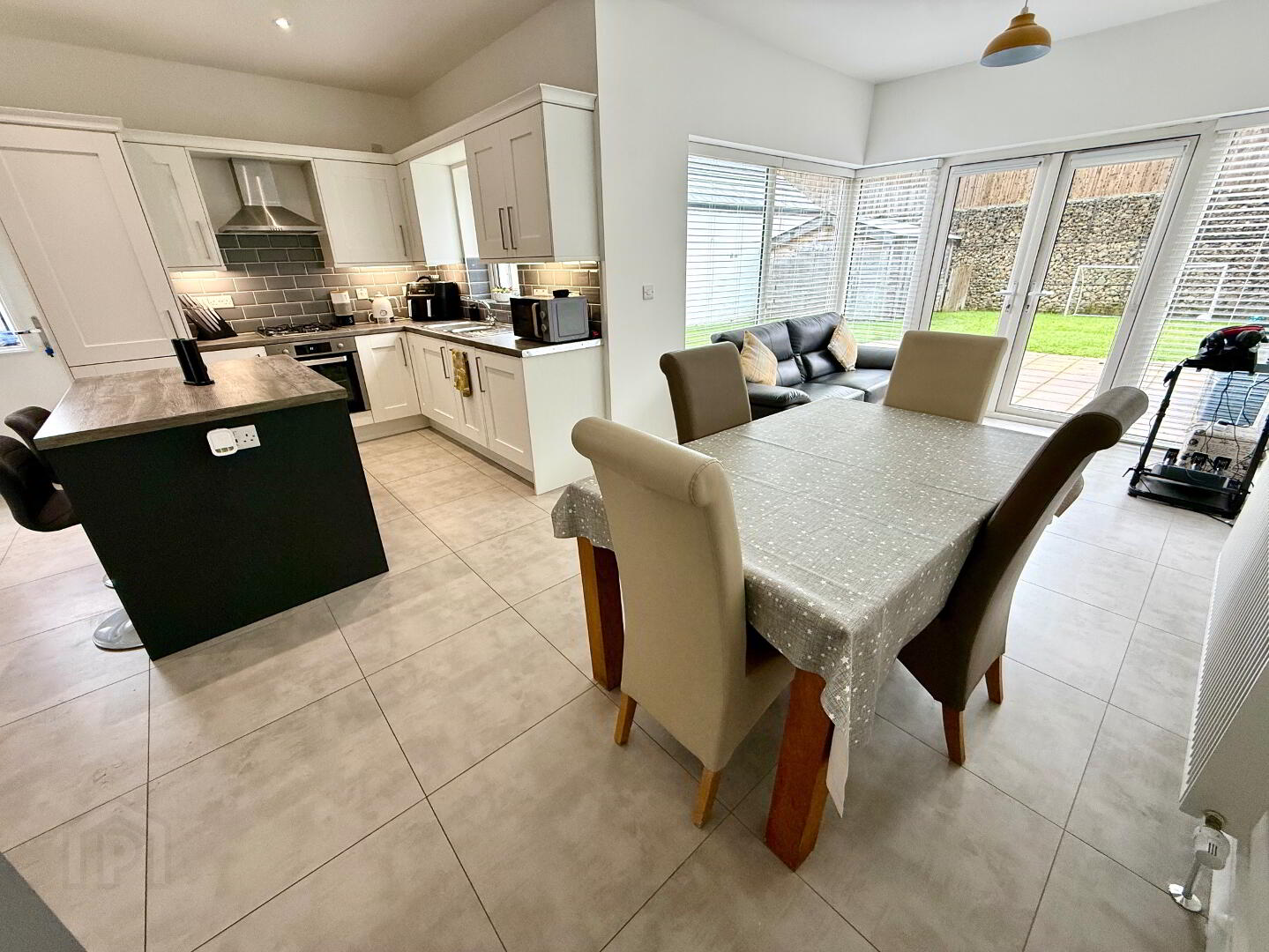 Kitchen/Dining/Family Area 24'10 x 18' Eye and loww level units, 1 1/4 bowl stainless steel sink unit with mixer tap, hob, oven and extractor fan, integrated dishwasher, integrated washing machine, recessed lighting, below eye level units, larder cupboard, broom cupboard, centre island with breakfast bar, partly tiled walls, tiled floor, double patiio doors.