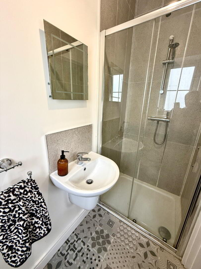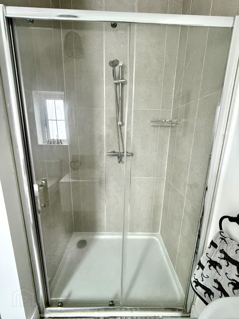 En-suite Fully tiled walk in shower, wash hand basin and WC, partly tiled walls, tiled floor.