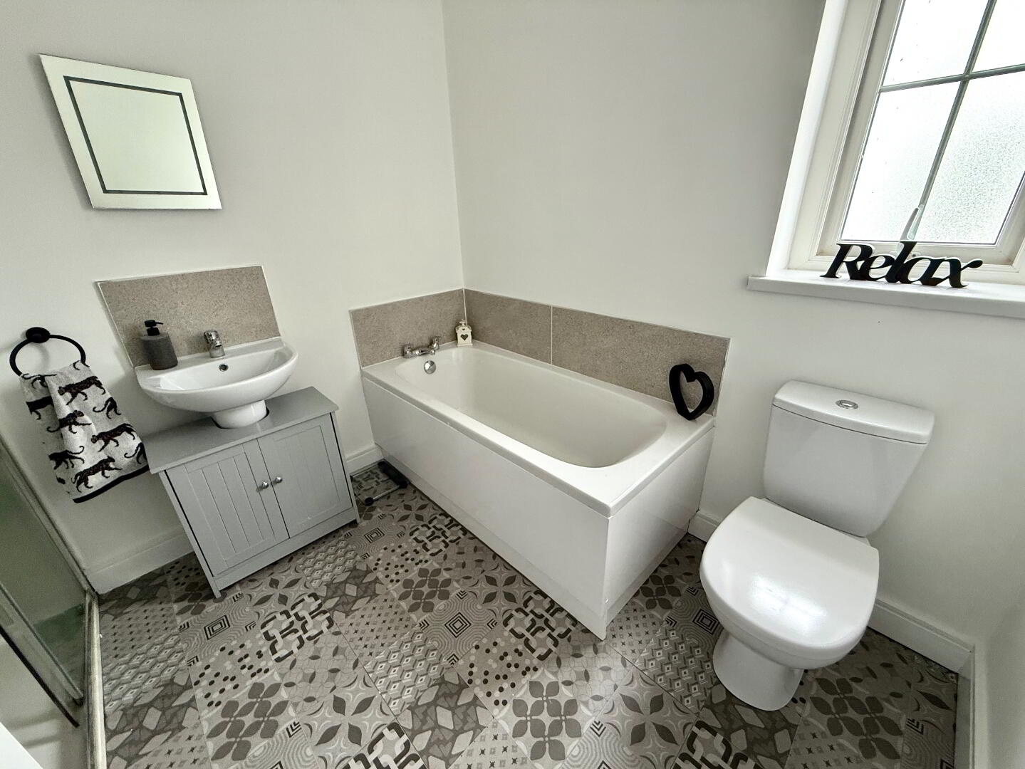 Bathroom Bath, wash hand basin and WC, fully tiled walk in shower, partly tiled walls, tiled floor.