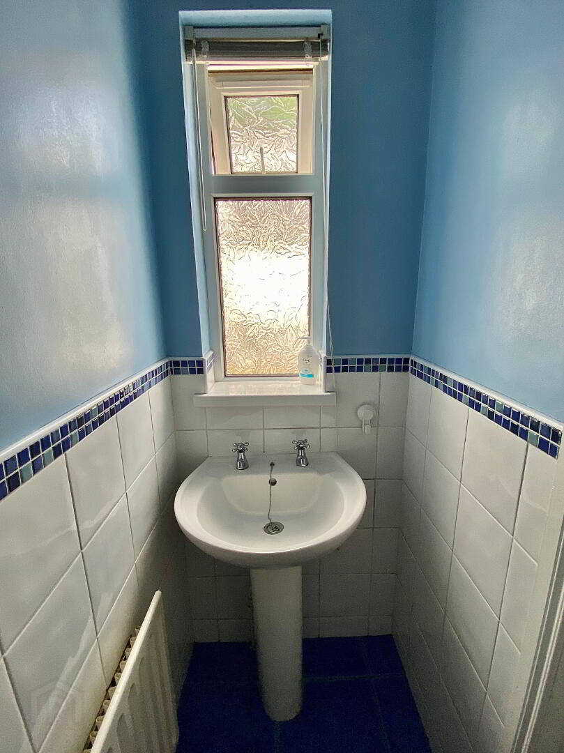 Downstairs WC WC and wash hand basin, partially tiled walls, tiled floor