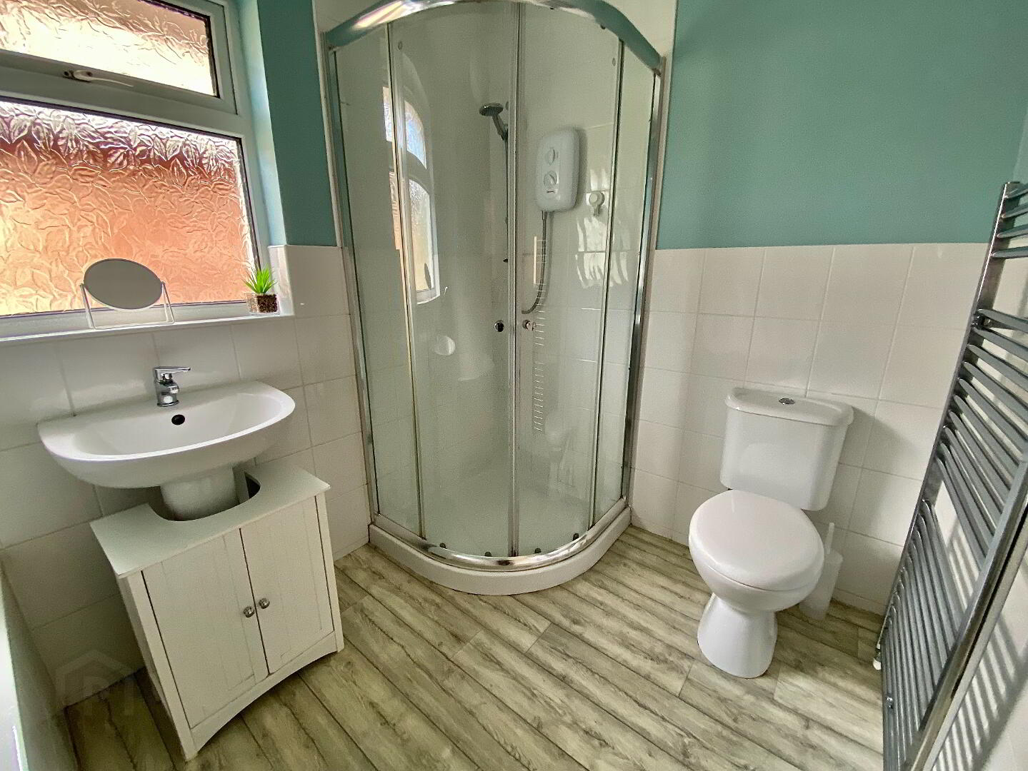 Bathroom Bath, wash hand basin and WC, fully tiled walk in electric shower, heated towel rail, partly tiled walls