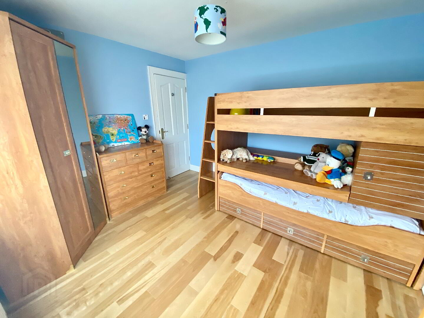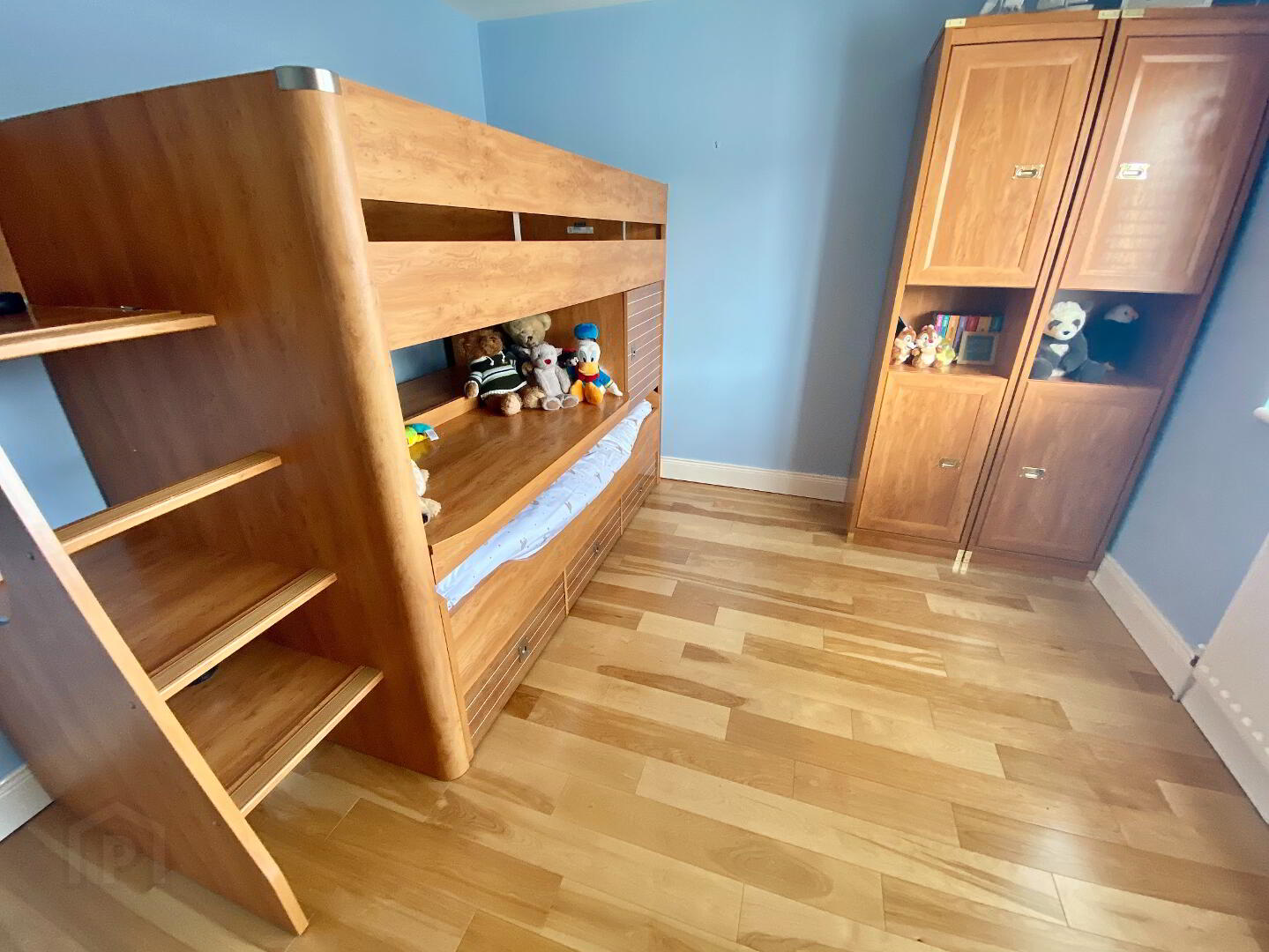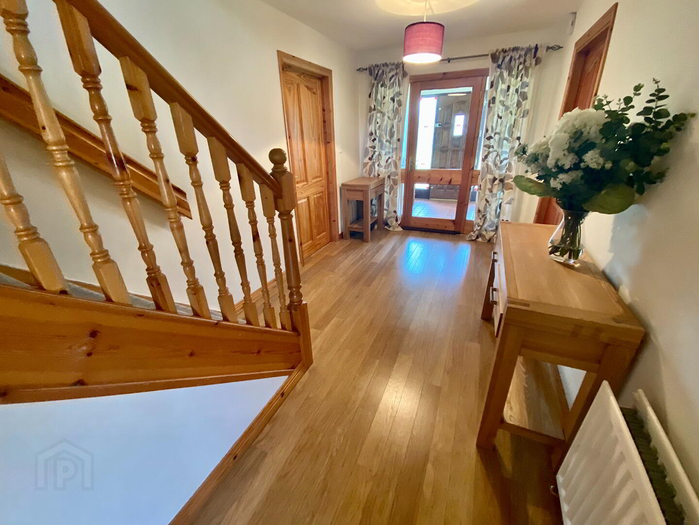 Hallway with laminated wooden floor, storage cupboard