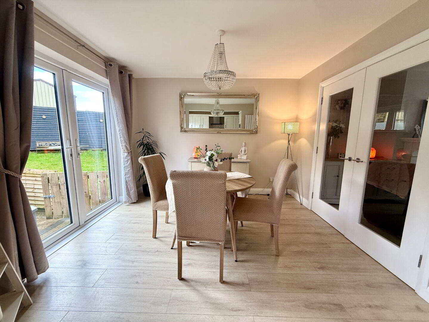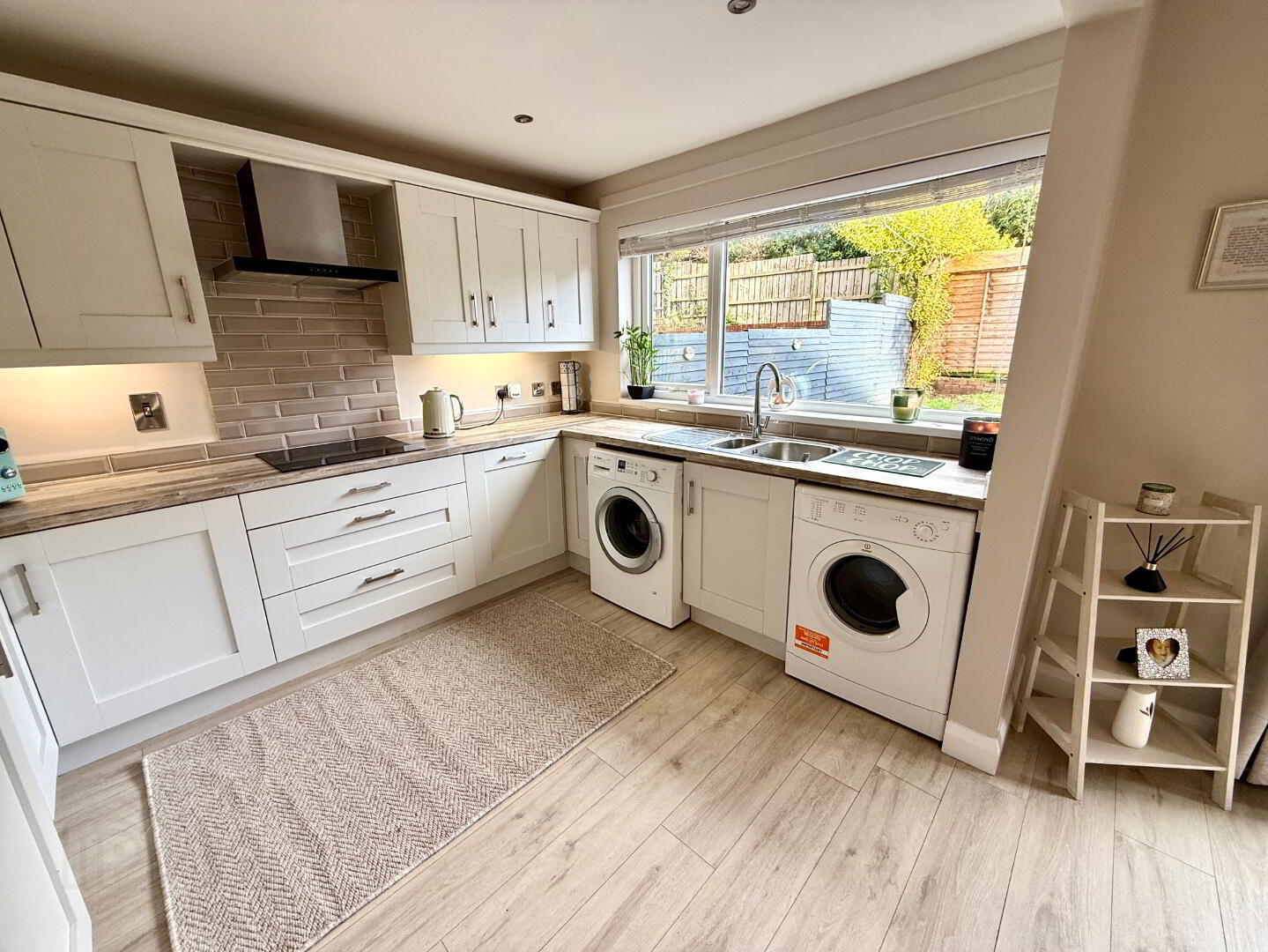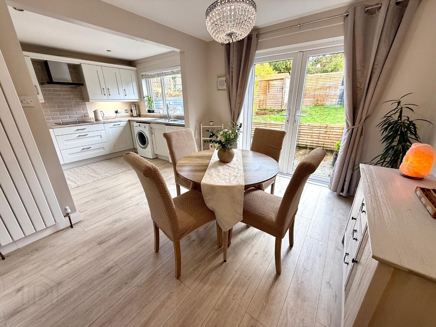 Kitchen/Dining 19'1 x 10'8 (to widest points) Eye and low level units, 1 1/4 bowl stainless steel sink unit with mixer tap, hob, oven and extractor fan, plumbed for washing machine, space for tumble dryer, integrated dishwasher, integrated fridge/freezer, recessed lighting in kitchen area, double patio doors, laminated wooden floor.