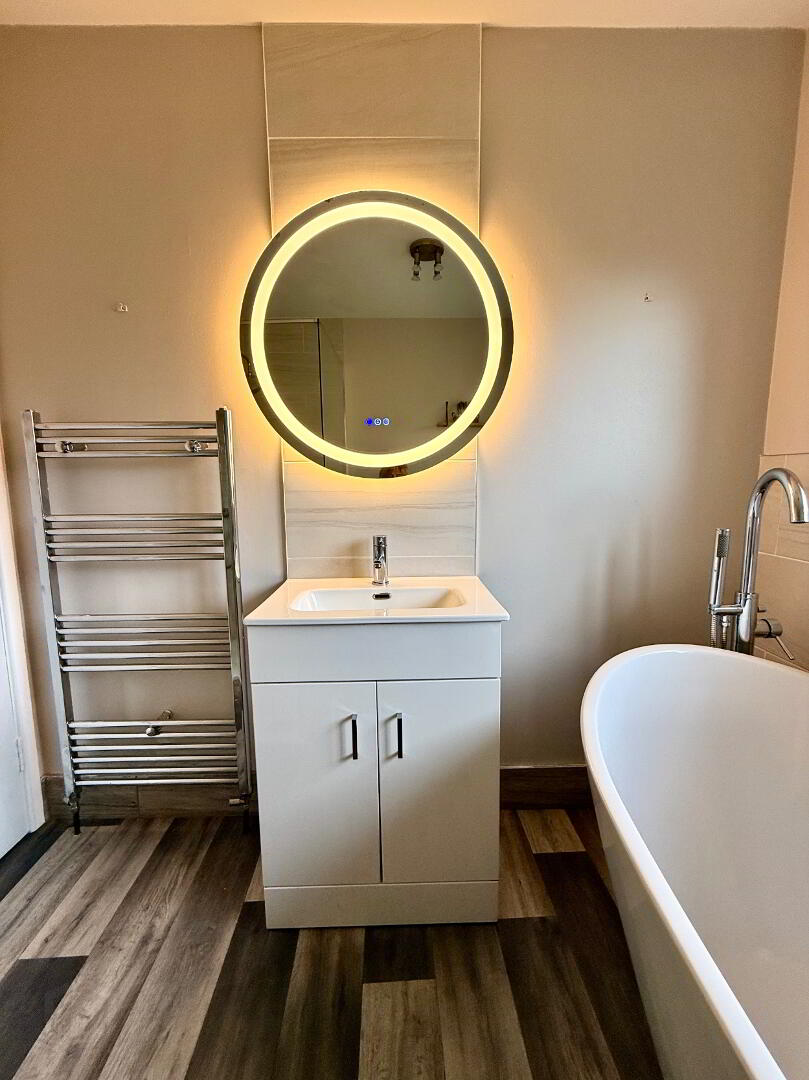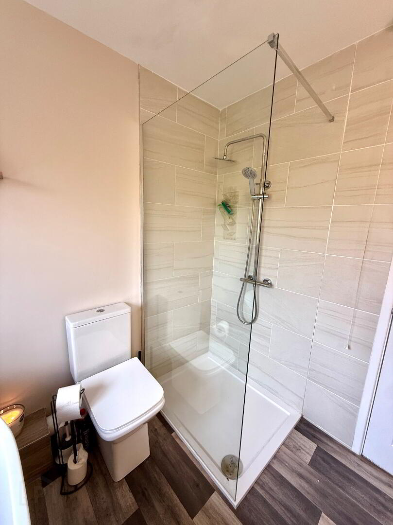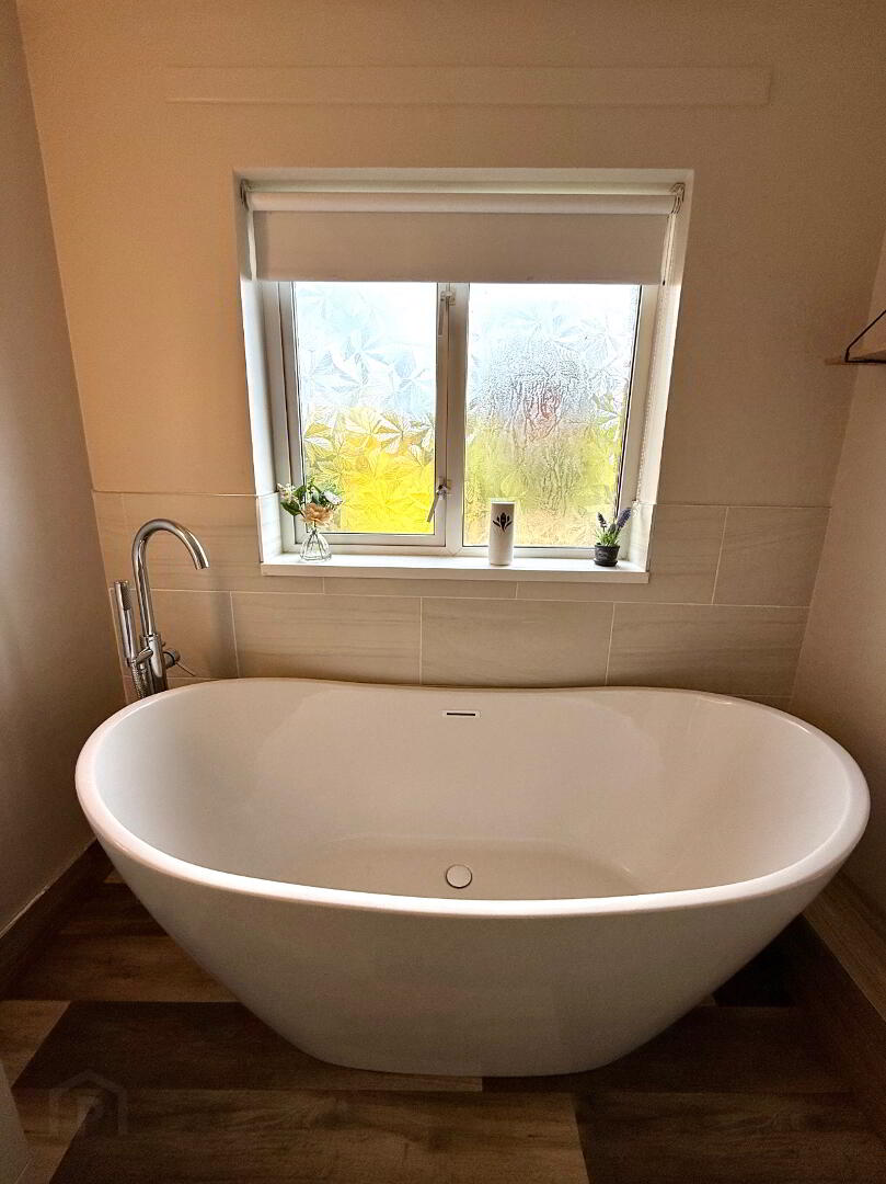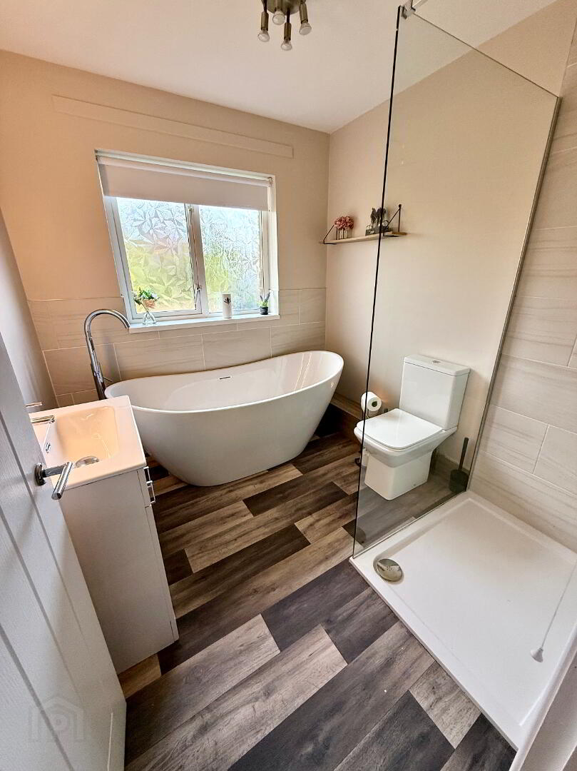 Bathroom Free standing bath, wash hand basin, WC, walk in shower, partly tiled walls.