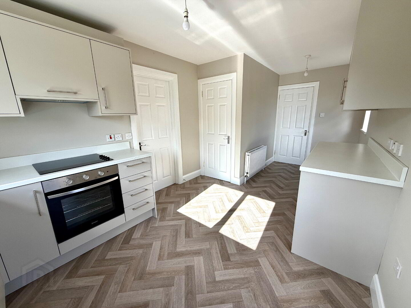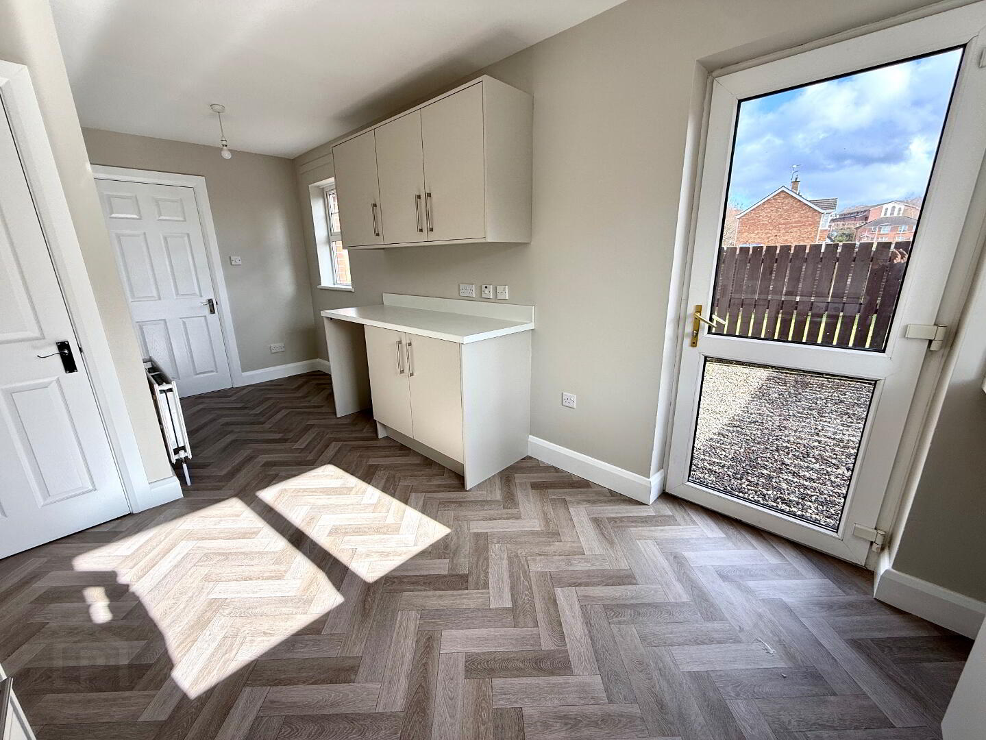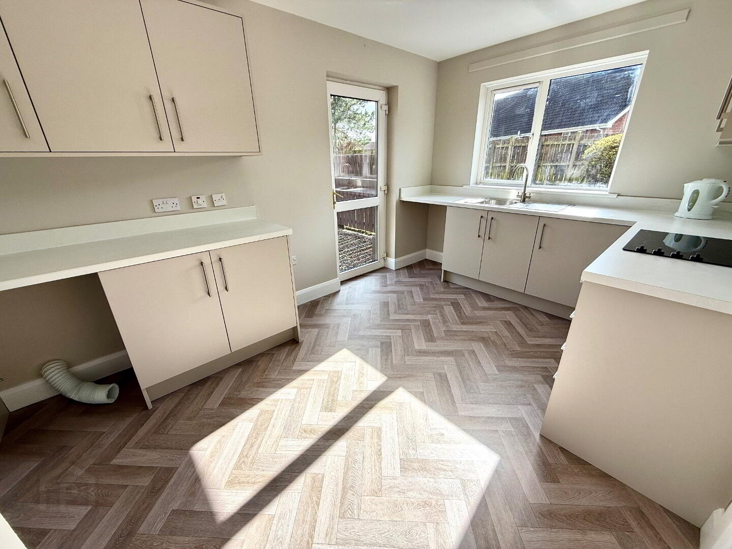 Kitchen 18'9 x 9'1 New Kitchen comprising of eye and low level units, single drainer stainless steel sink unit with mixer tap, hob, oven and extractor fan, plumbed for washing machine, vented for tumble dryer, understairs storage.