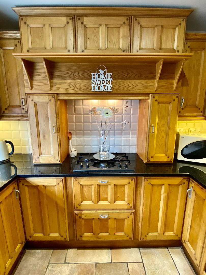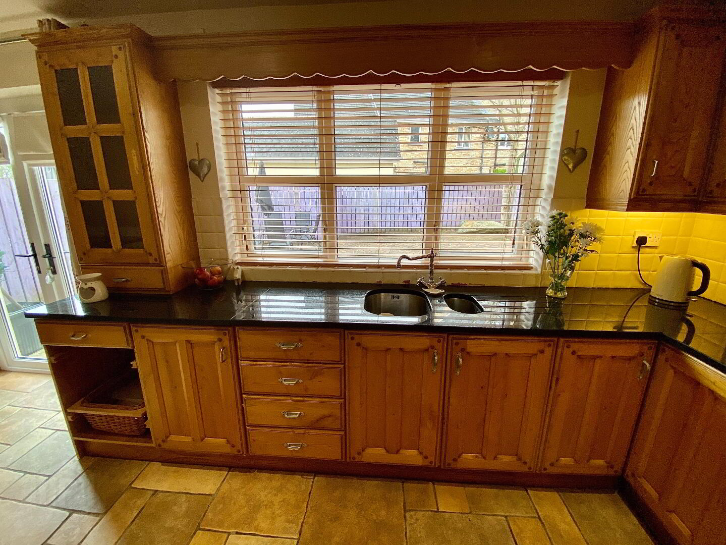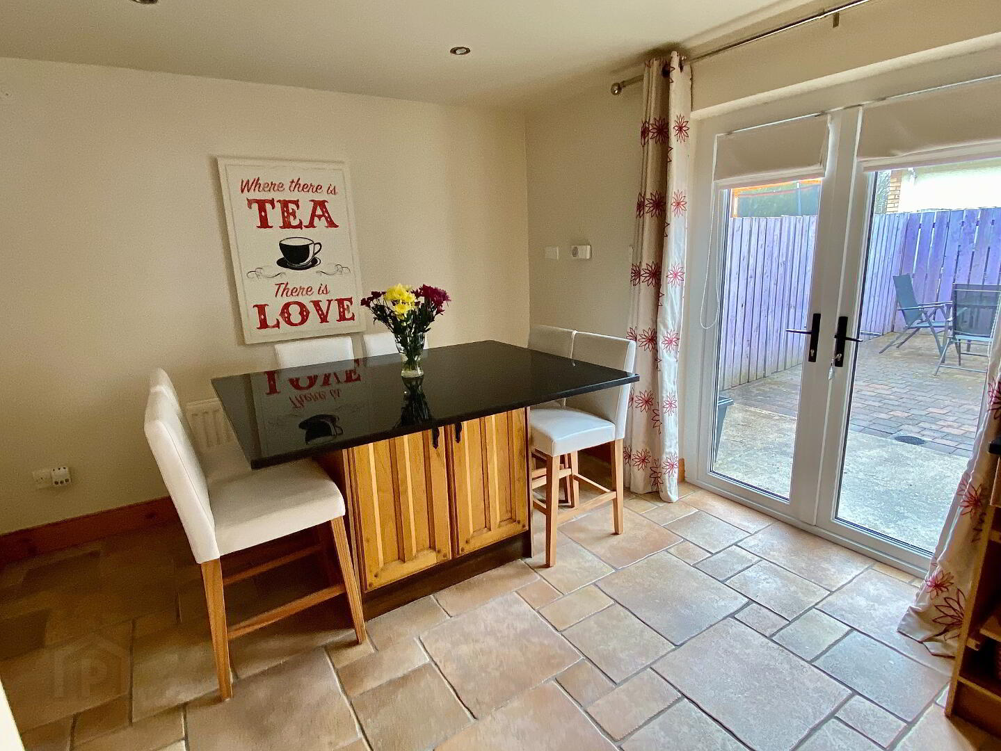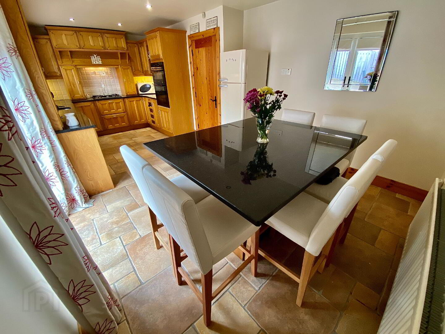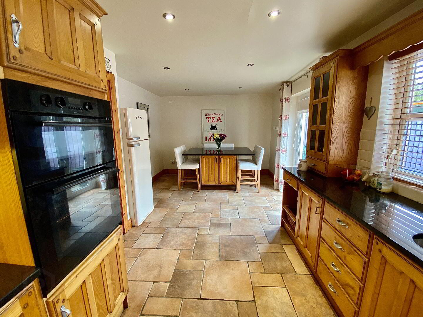 Kitchen/Dining 20'9 x 10'9 (to widest points) Eye and low level units, 1 1/2 bowl stainless steel sink unit set in granite worktop, hob, double wall oven and extractor fan, concealed lighting below eye level units, open display shelves, wine rack, centre island with seating, double patio doors, partly tiled walls, tiled floor, recessed lighting