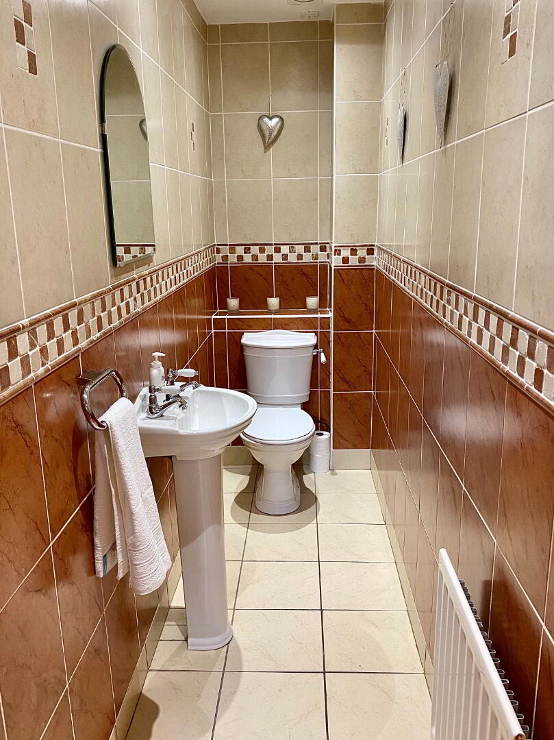 Downstairs WC WC and wash hand basin, fully tiled walls, tiled floor, recessed lighting