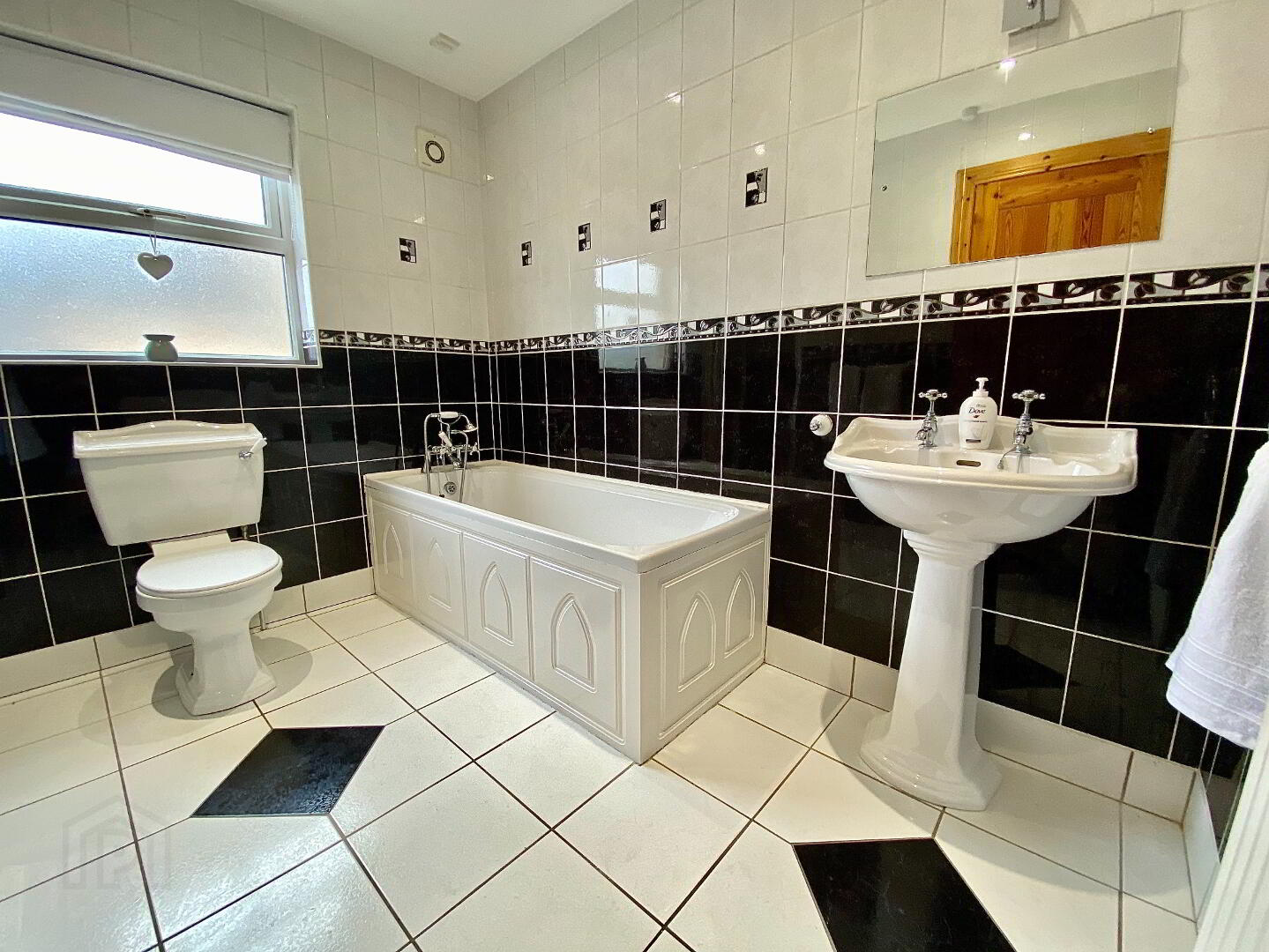 Bathroom Bath, wash hand basin, WC, fully tiled walk in electric shower, fully tiled walls, tiled floor