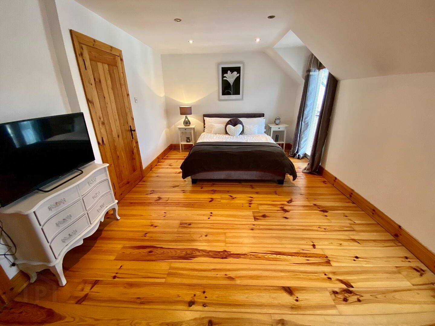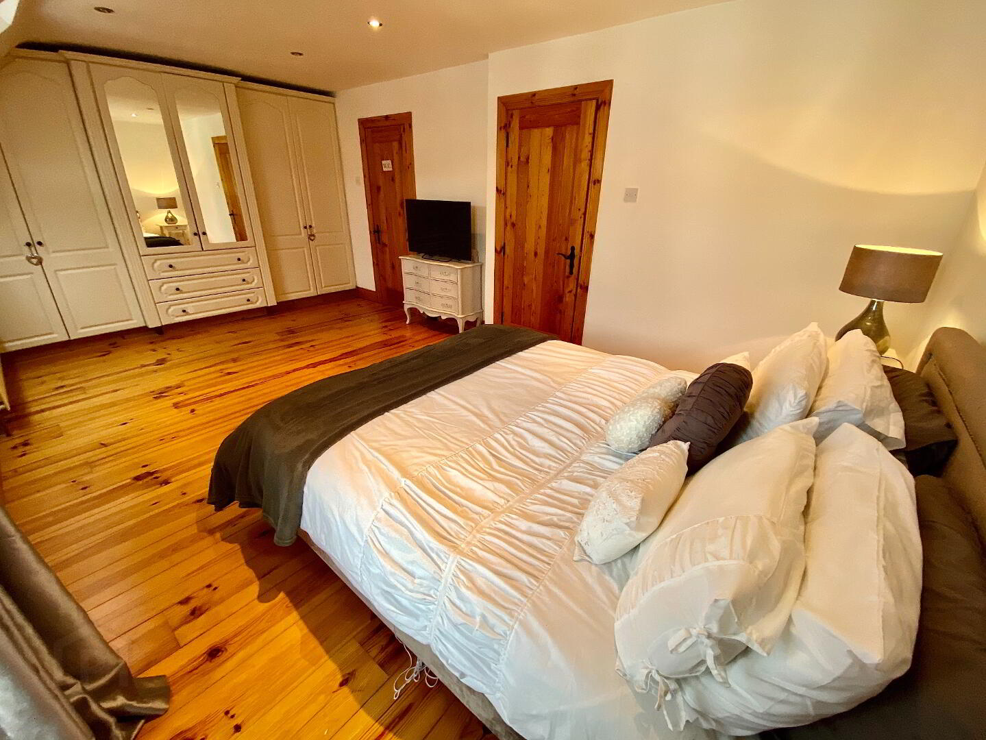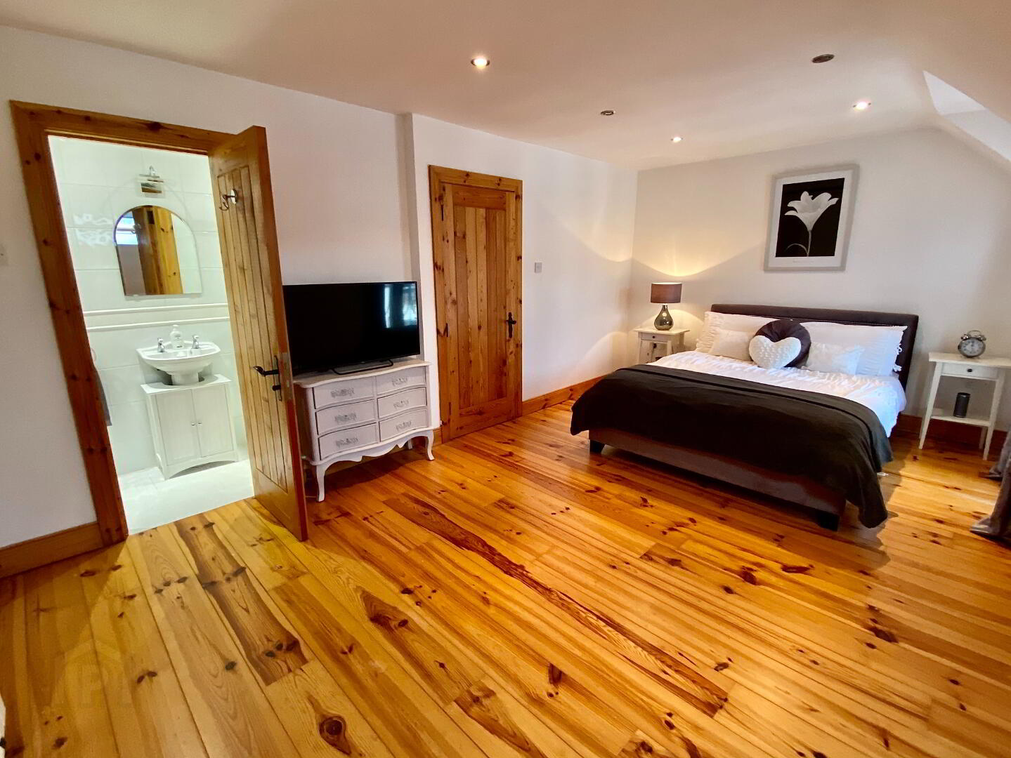 Bedroom 1 17'9 x 11' (to widest points) Fitted with wall to wall built in wardrobes and drawers, double doors to Juliet balcony, wooden floor, recessed lighting. En-suite; Fully tiled walk in shower, wash hand basin, WC, fully tiled walls, tiled floor, recessed lighting