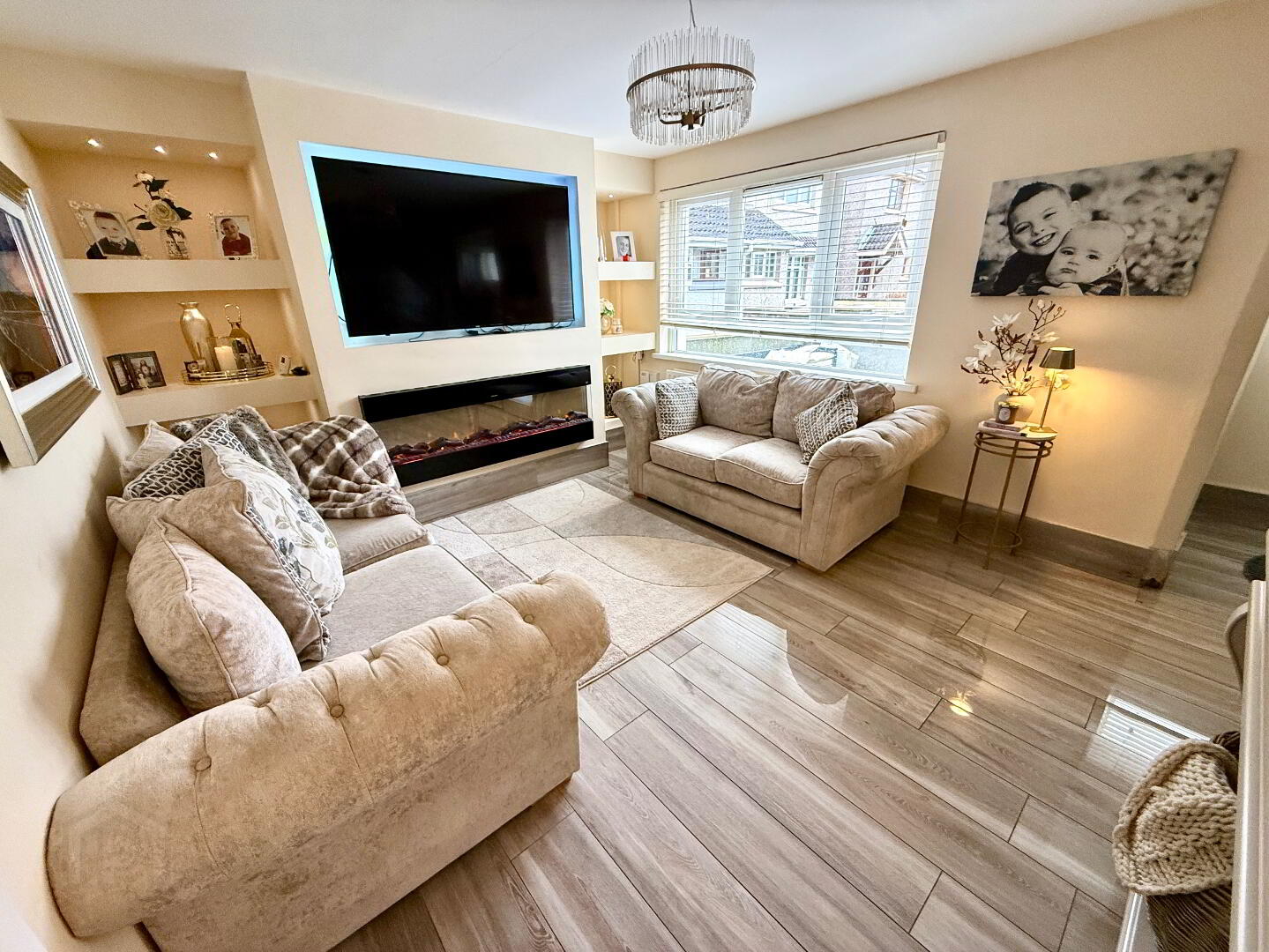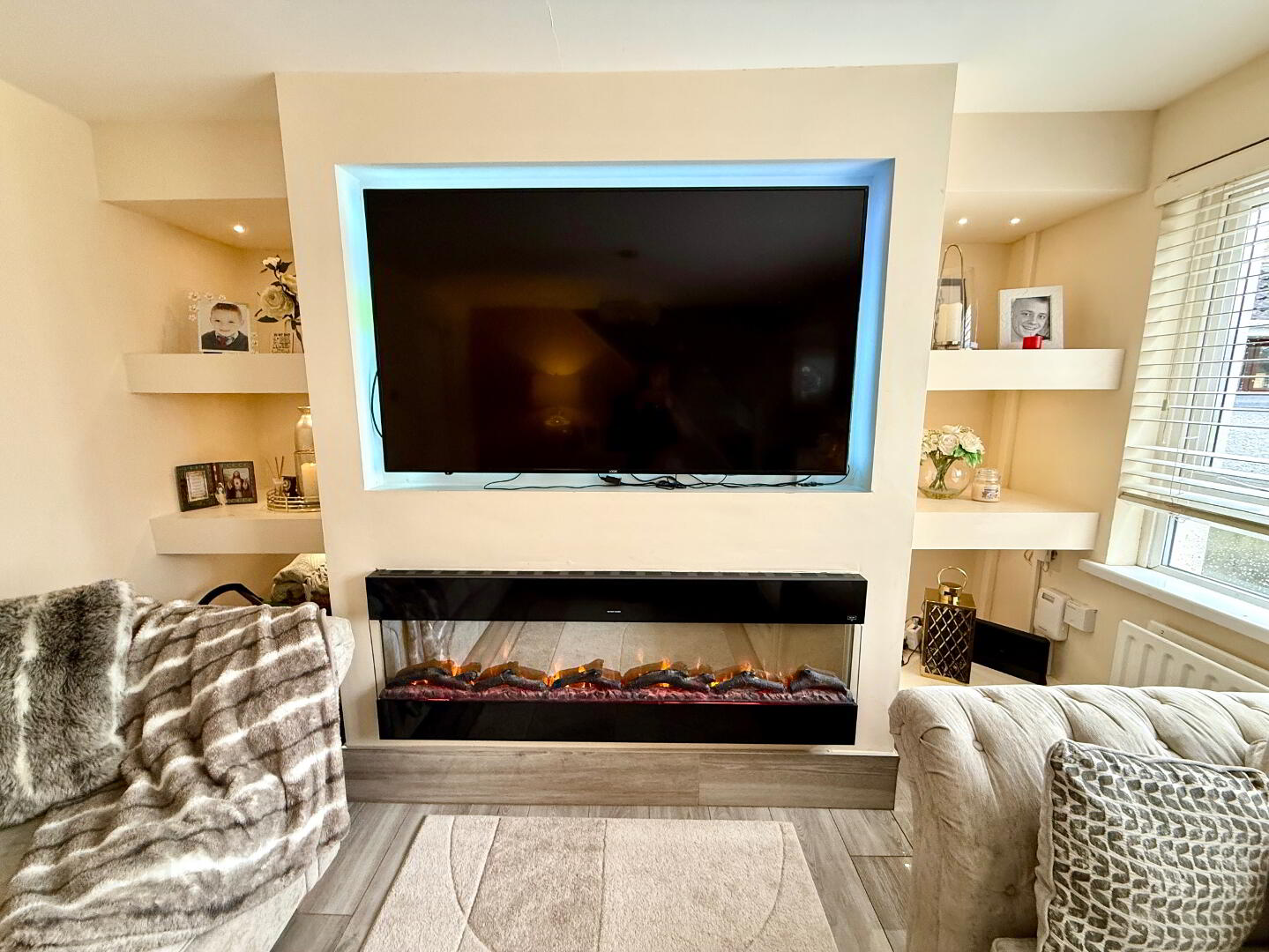 Lounge 14'9 x 11'2 (to widest points) Feature media wall with open display shelves, wall mounted electric fire, tiled floor.