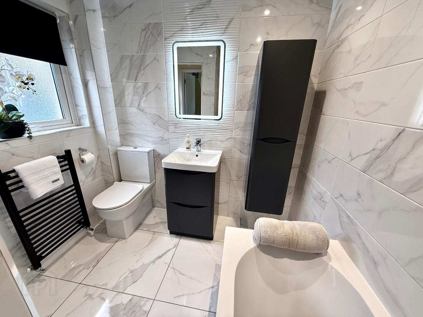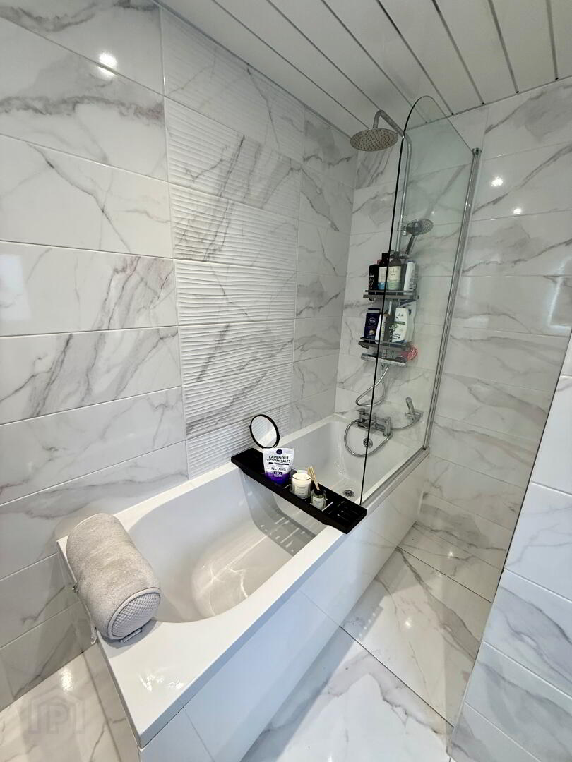 Bathroom Bath with rainshower over head, wash hand basin set in vanity unit, WC, wall cabinet, wall mirror, fully tiled walls, heated towel rail, recessed lighting, tiled floor.