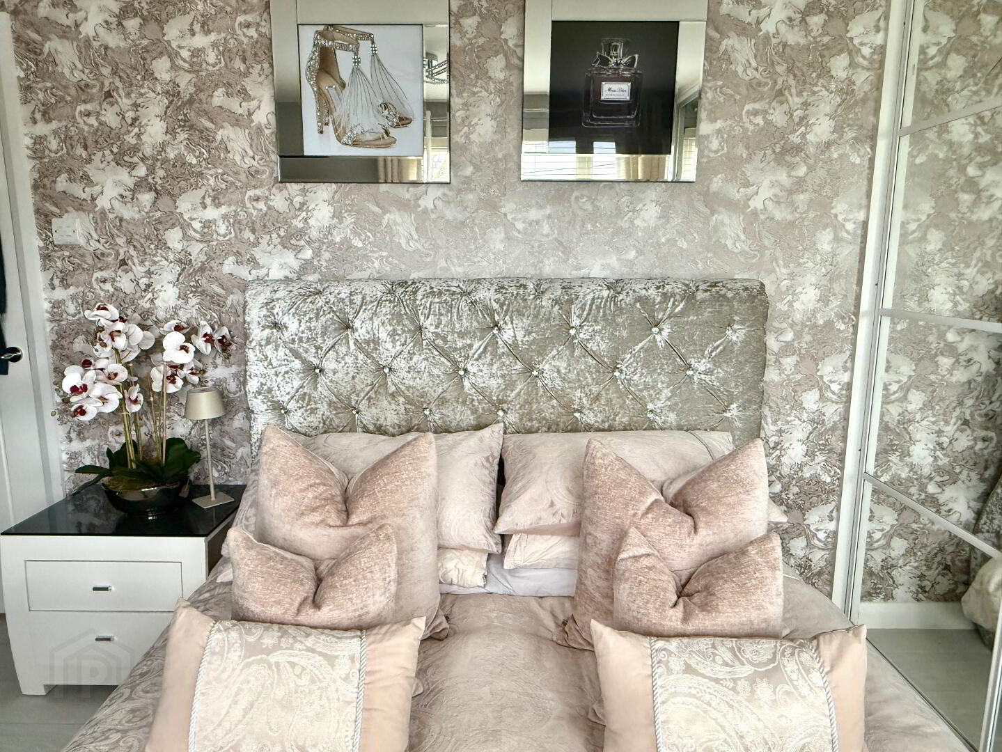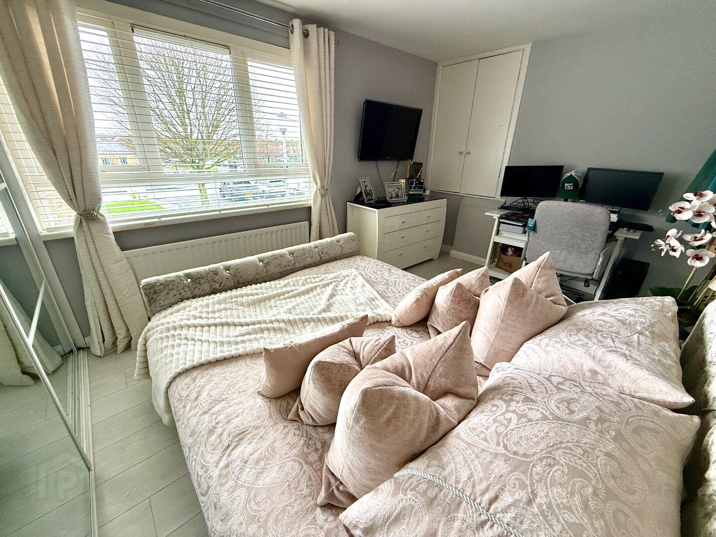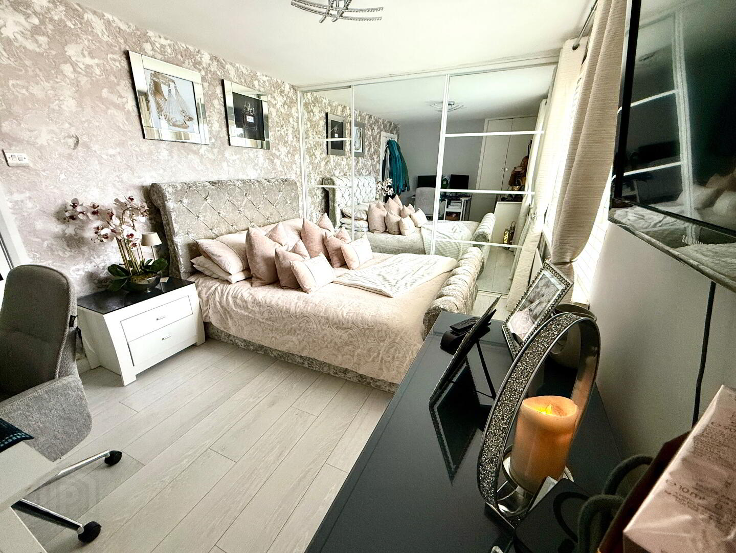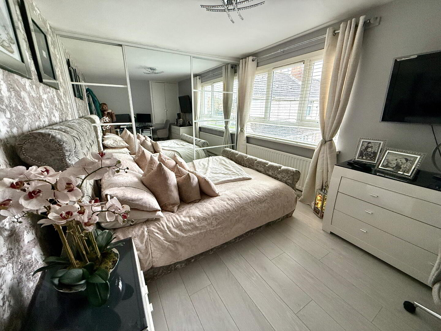 Bedroom 1 12'9 x 9'6. Fitted with wall to wall mirror sliderobes, storage cupboard, laminated wooden floor.