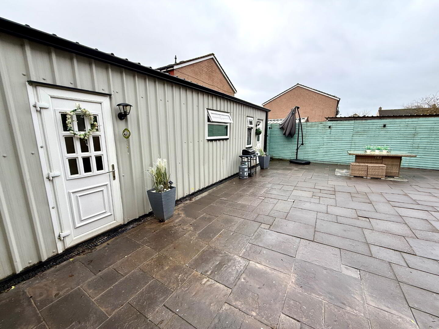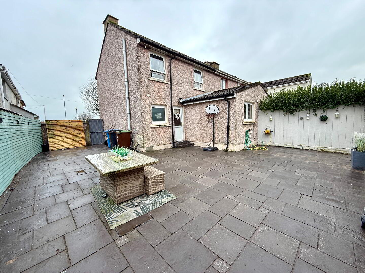 Paved area to rear enclosed by fence.