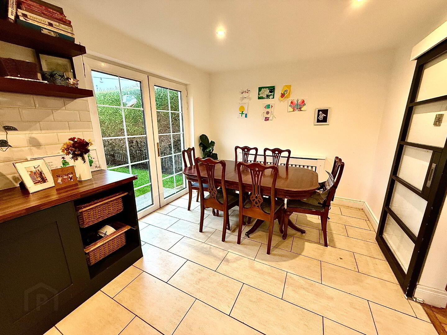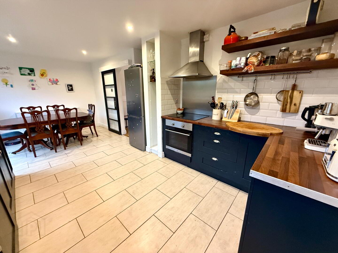 Kitchen/Dining 20'1 x 9'6 Low level units, open dispplay units, Belfast sink with mixer tap, hob, oven and extractor fan, integrated dishwasher, partly tiled walls, tiled floor, double patio doors, recessed lighting .