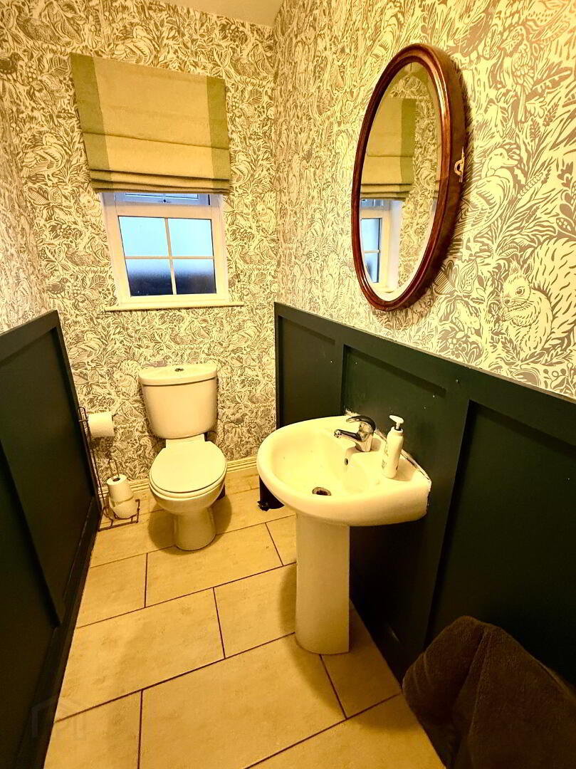 Downstairs WC WC and wash hand basin, walls partially wood panelled, tiled floor.