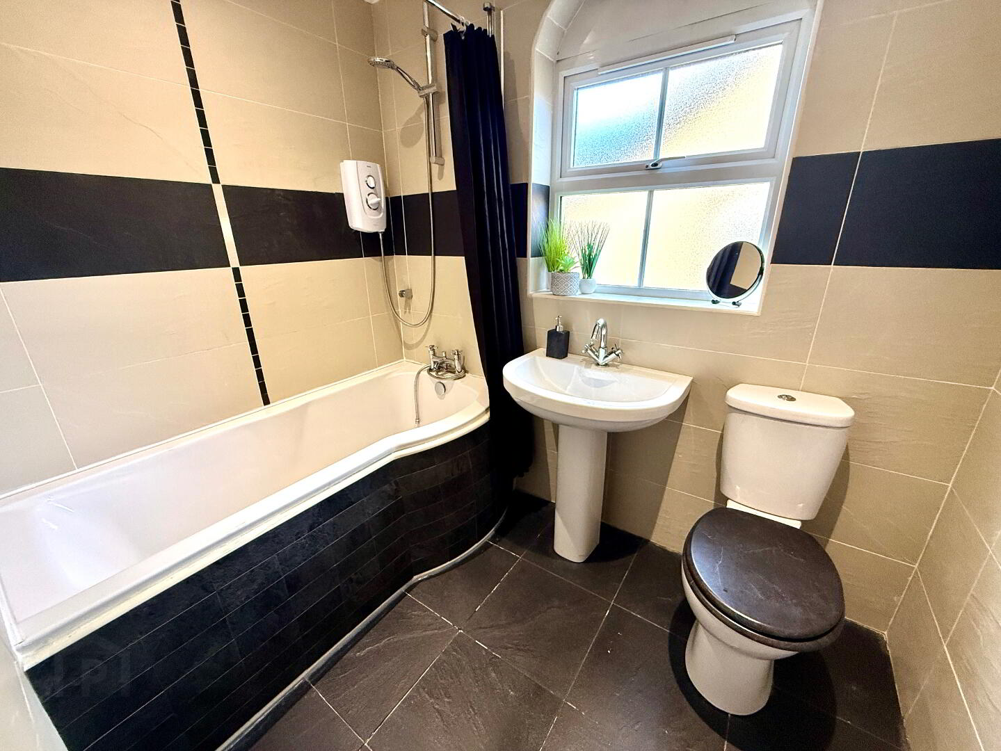 Bathroom Bath with electric shower overhead, wash hand basin and WC, fully tiled walls, tiled floor, recessed lighting.