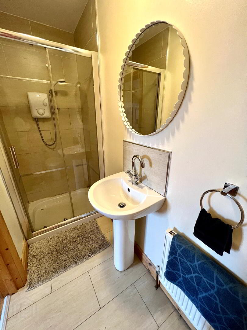 En-suite Fully tiled walk in power shower, wash hand basin and WC, partly tiled walls, tiled floor.