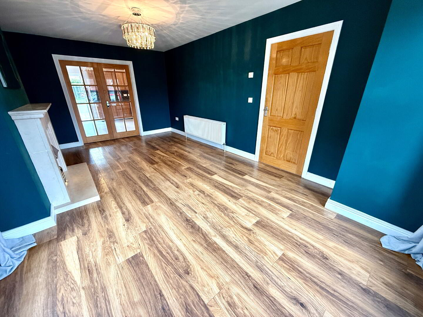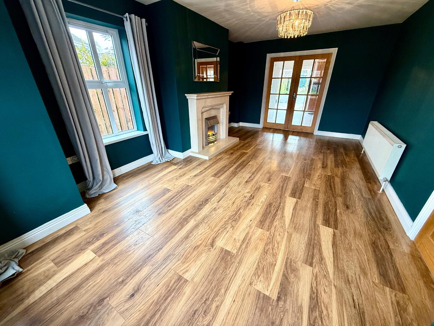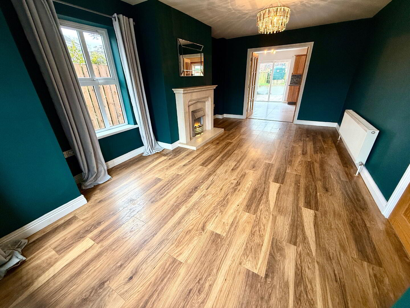 Lounge 19'5 x 11'8 (to widest points) Dual aspect, sandstone fireplace and hearth, laminated wooden floor, double doors to Kitchen/Dining.