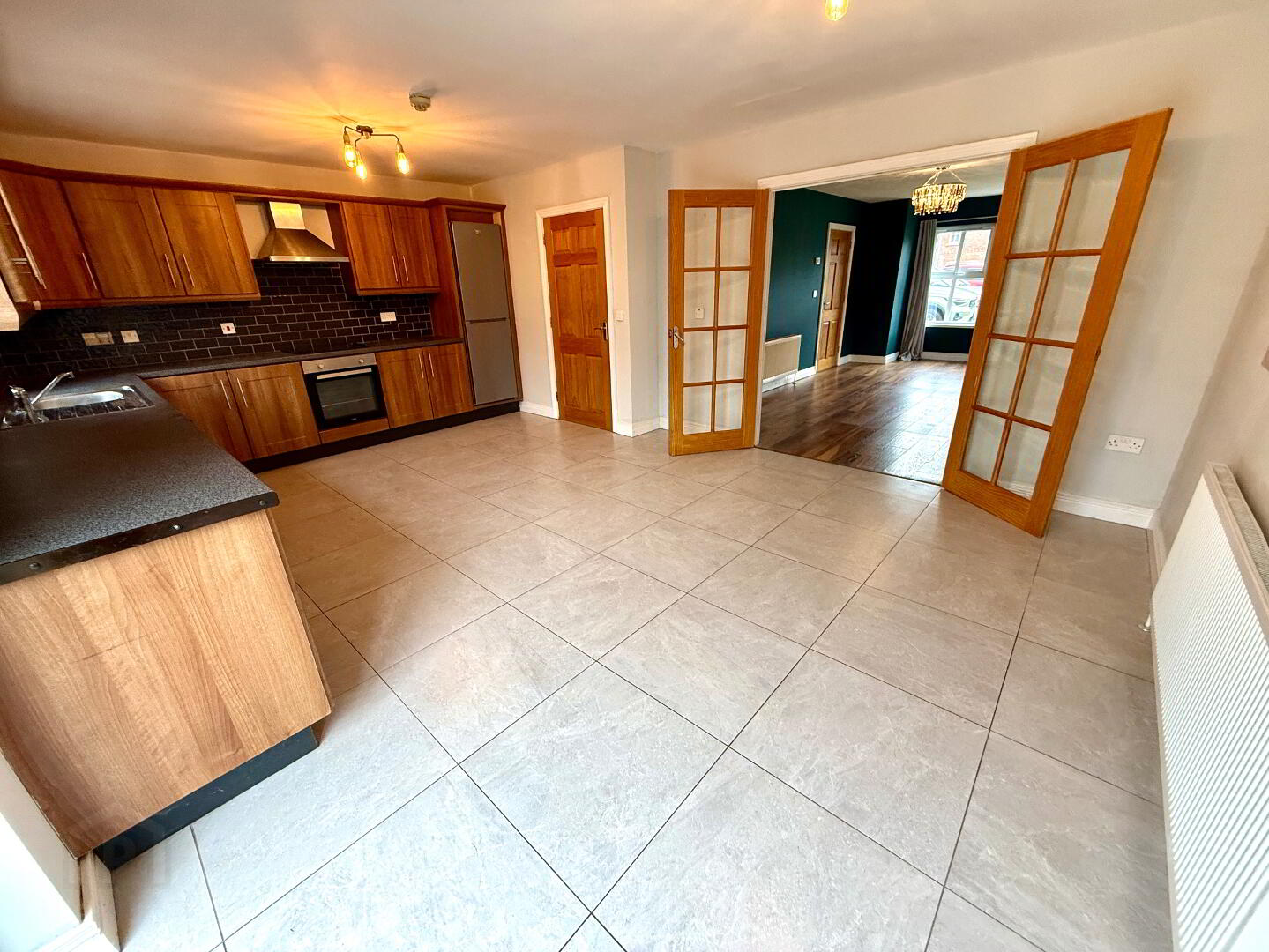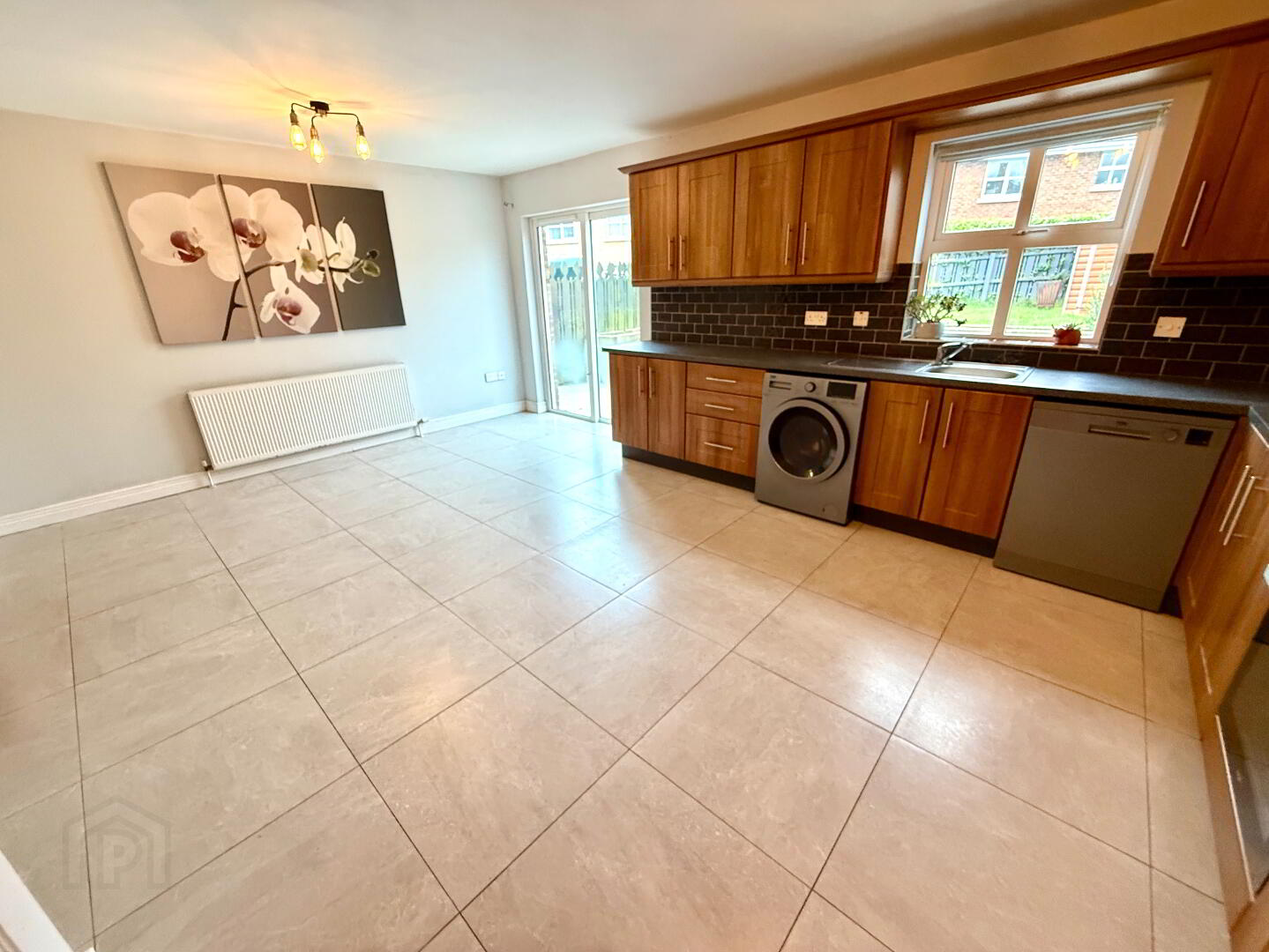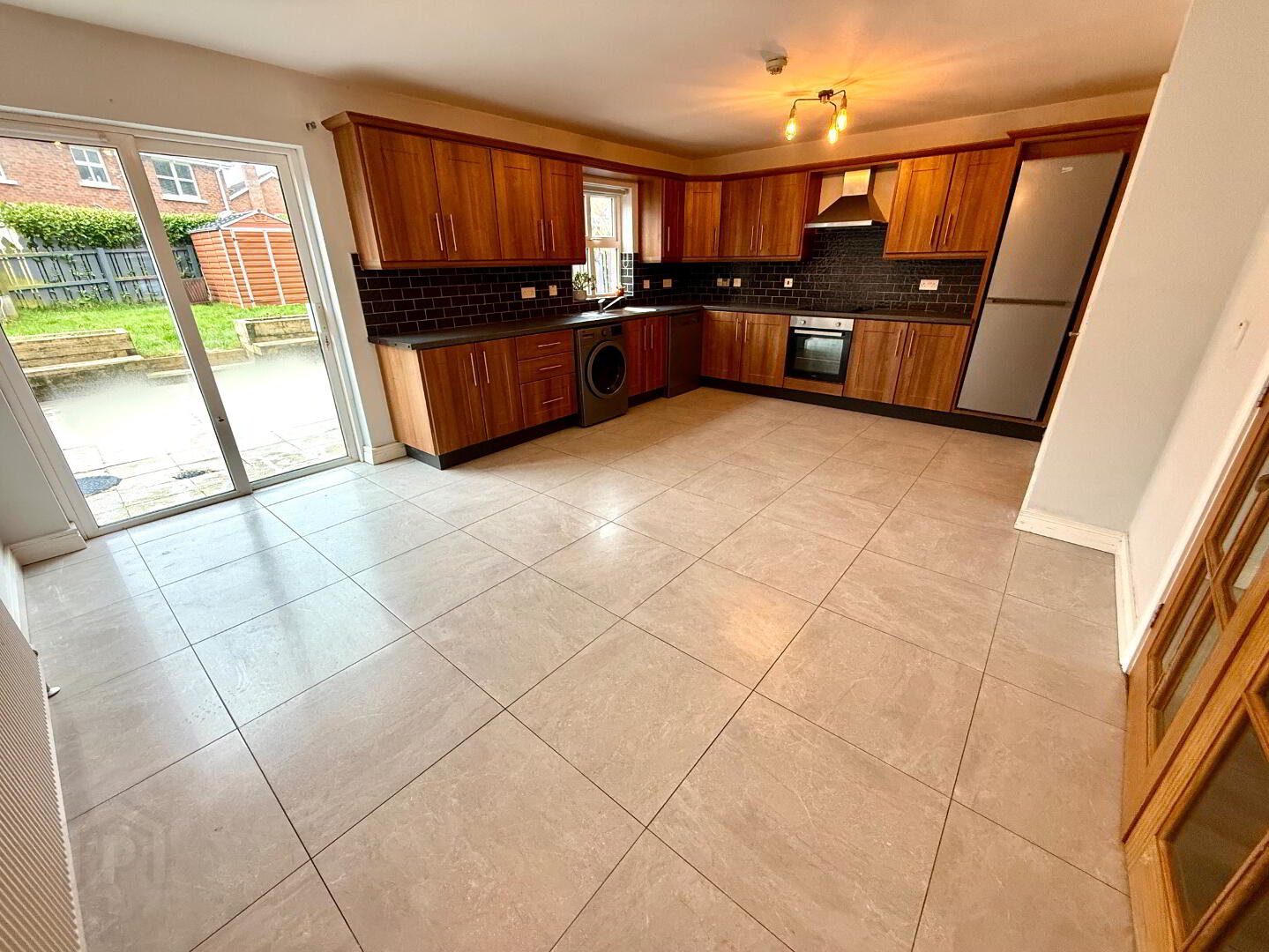 Kitchen/Dining 19'3 x 13'8 (to widest points) Eye and low level units, single drainer stainless steel sink unit with mixer tap, hob, oven and extractor fan, dishwasher, washer/dryer, fridge/freezer, partly tiled walls, tiled floor, patio door.