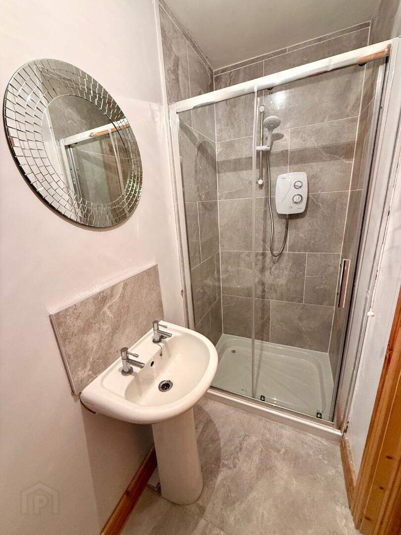 En-suite Fully tiled walk in power shower, wash hand basin and WC, partly tiled walls, tiled floor.
