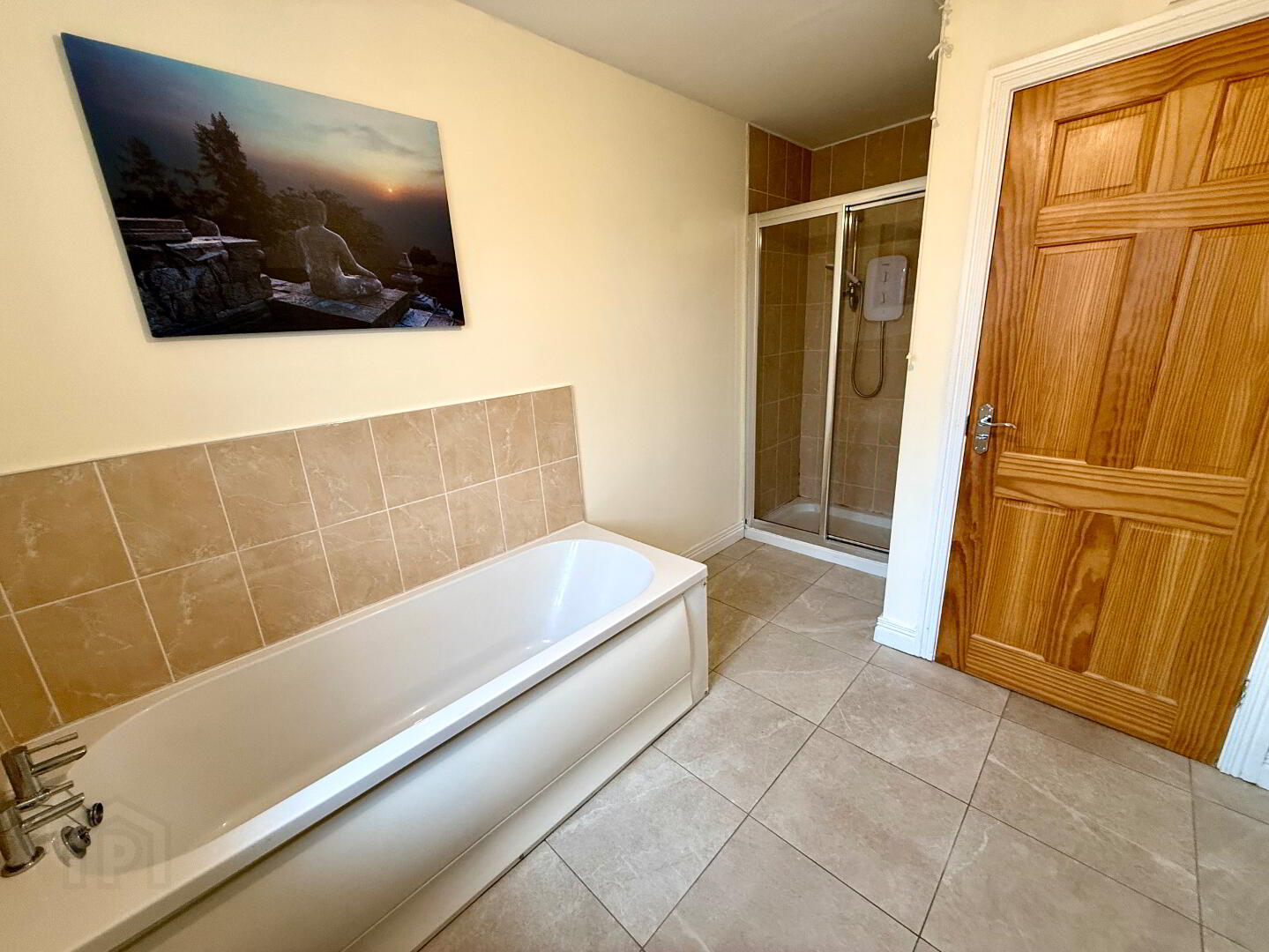 Bathroom Bath, wash hand basin and WC, fully tiled walk in electric shower, partly tiled walls, tiled floor.