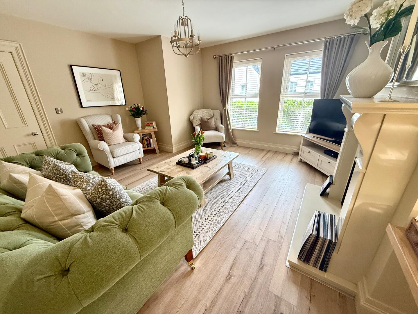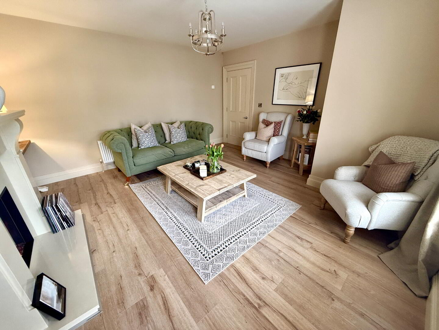 Lounge 15'2 x 14'6 (to widest points) Marble fireplace and hearth with electric fire, laminated wooden floor.