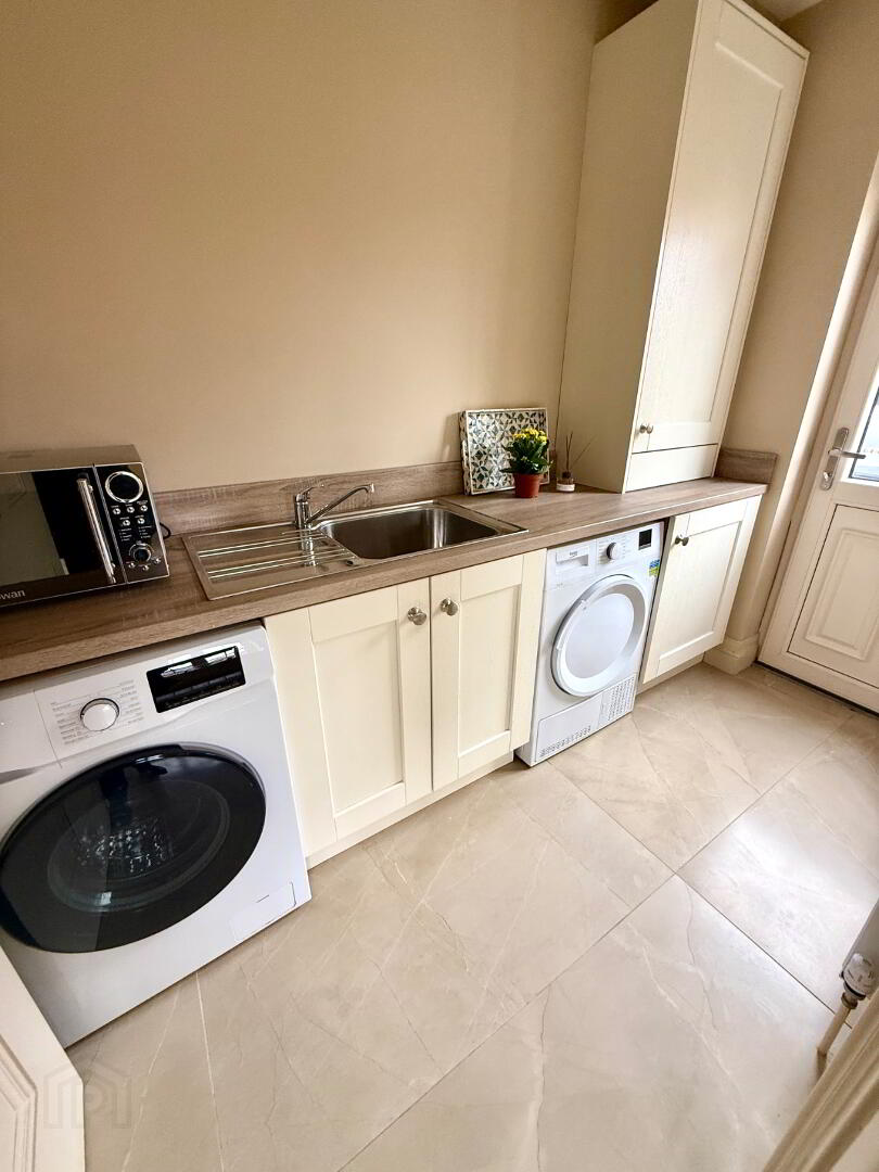 Utility Room Low level units, single drainer stainless steel sink unit with mixer tap, plumbed for washing machine, space for tumble dryer, tiled floor.