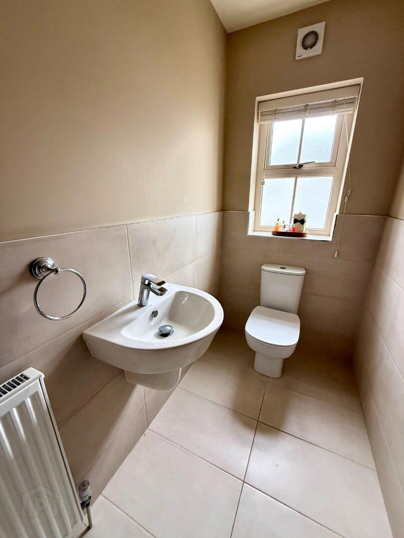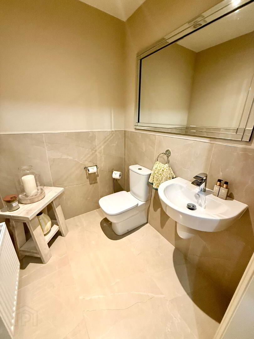 Downstairs WC WC and wash hand basin, partly tiled walls, tiled floor, recessed lighting.