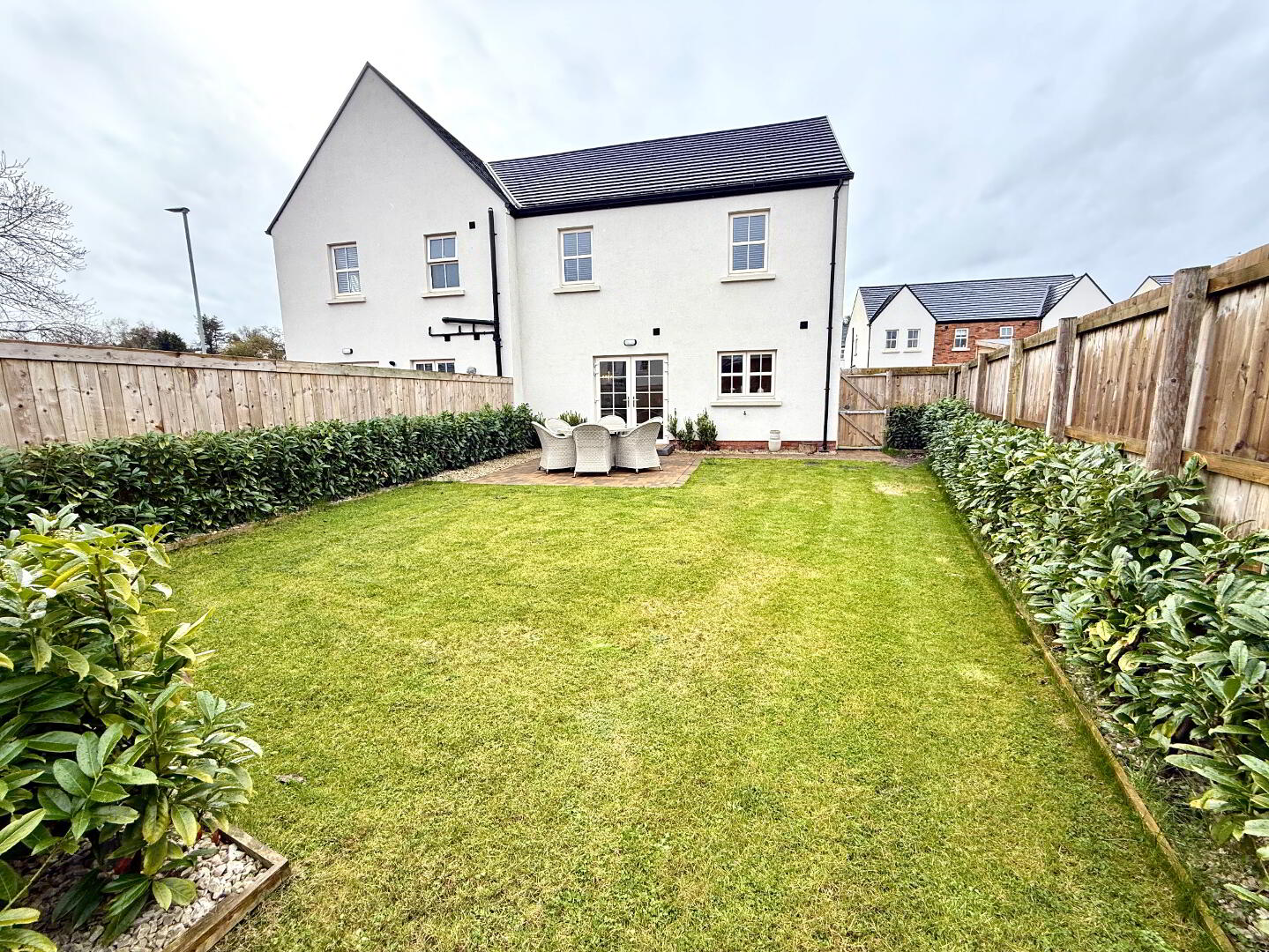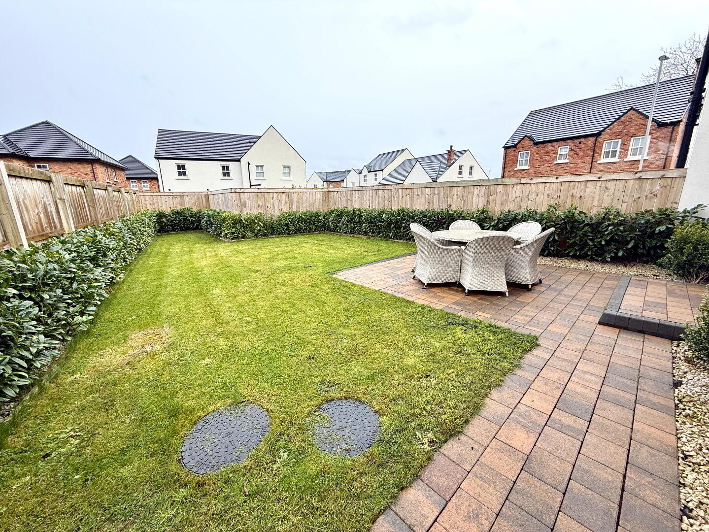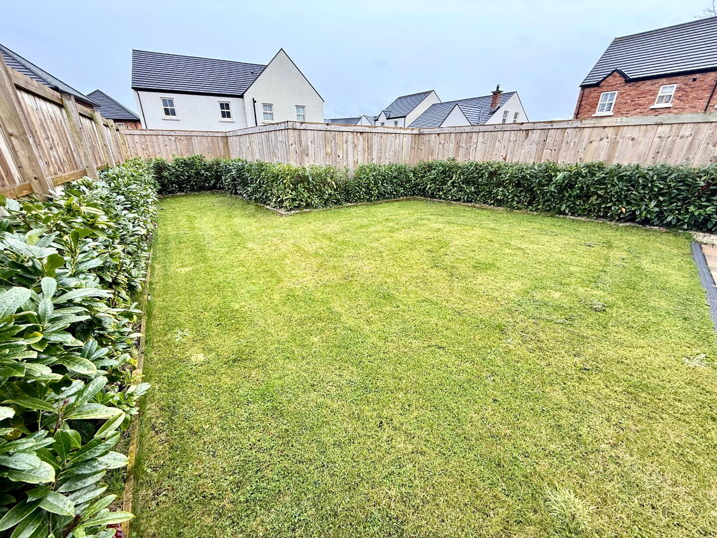 Garden to rear laid in lawn enclosed by fence and hedge.