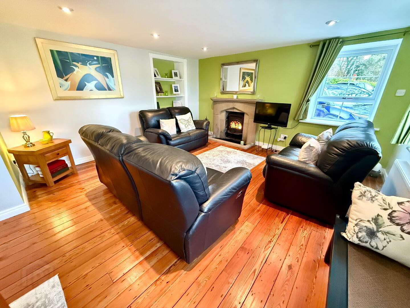 Lounge 24'4 x 14'6 (to widest points) Dual aspect, sandstone fireplace with woodburning stove, open display shelves, recessed lighting, wooden floor.
