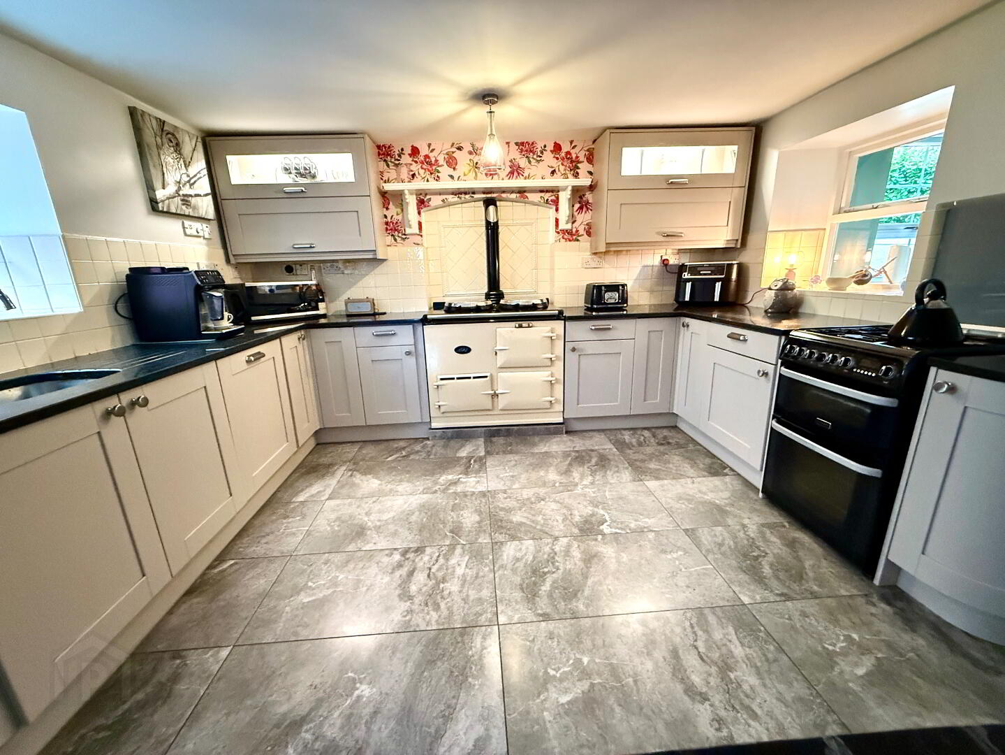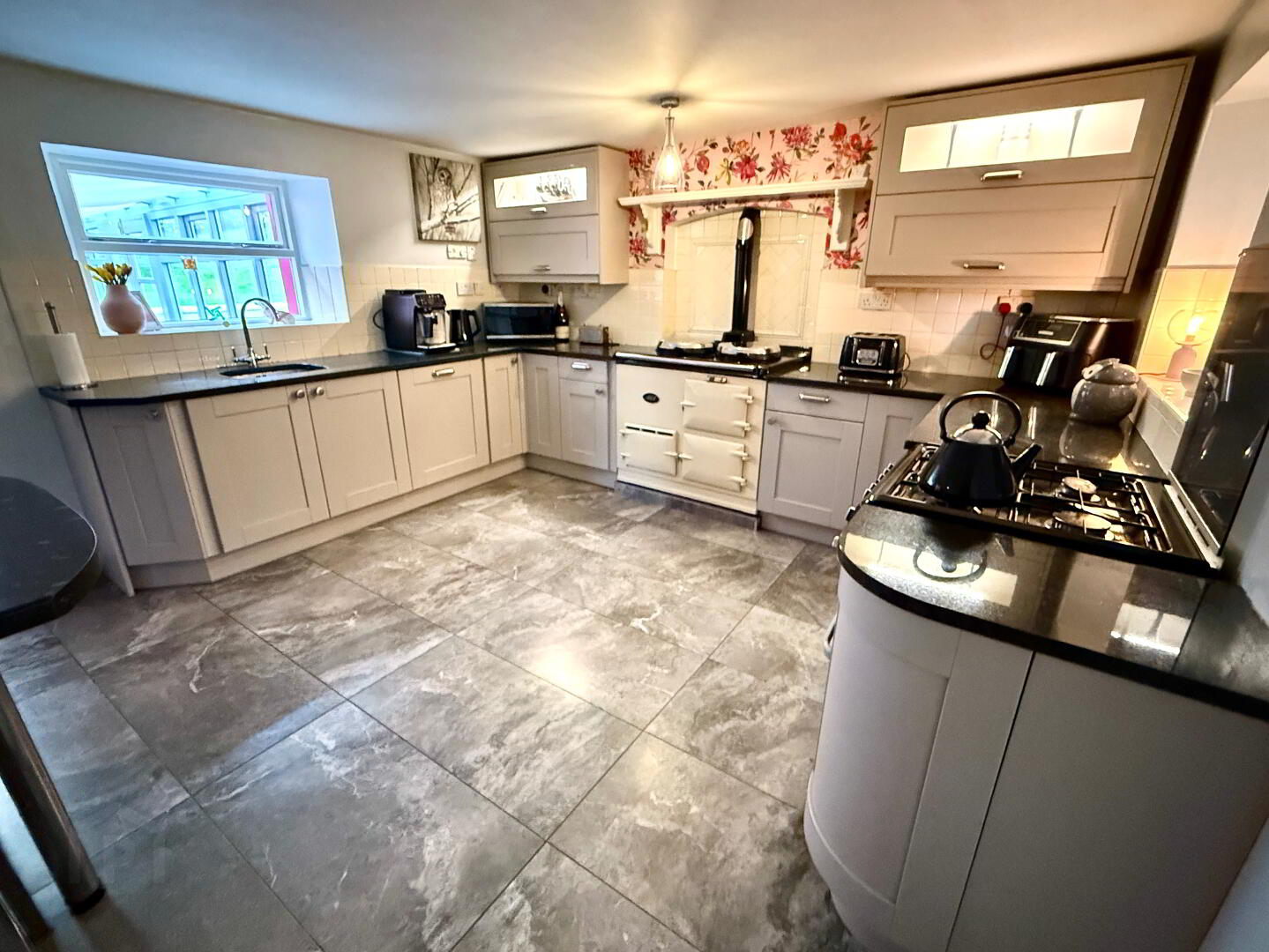 Kitchen 14'10 x 12'6 Eye and low level units, stainless steel sink unit with mixer tap, AGA Range Cooker, wired for electric cooker and piped for gas hob partly tiled walls, tiled floor, pantry, breakfast bar with seating.