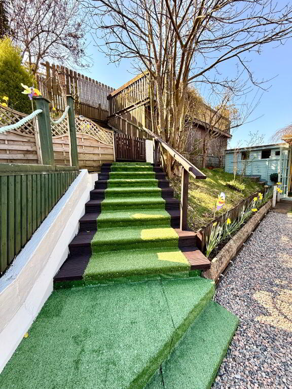 Tiered garden area to rear with Garden rooms, workshop, garden sheds and decked area with fabulous views over Lough Foyle and the Donegal hill.