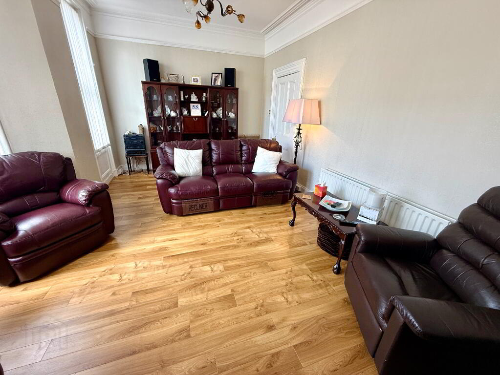 Family Room 12'3 x 11'5 Multi fuel stove with high output back boiler, laminated wooden floor, ceiling cornicing, picture rail and centre rose.
