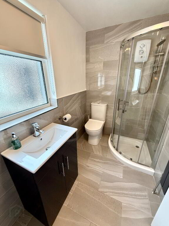 Shower Room Fully tiled walk in electric shower, wash hand basin set in vanity unit, WC, partly tiled walls, tiled floor.